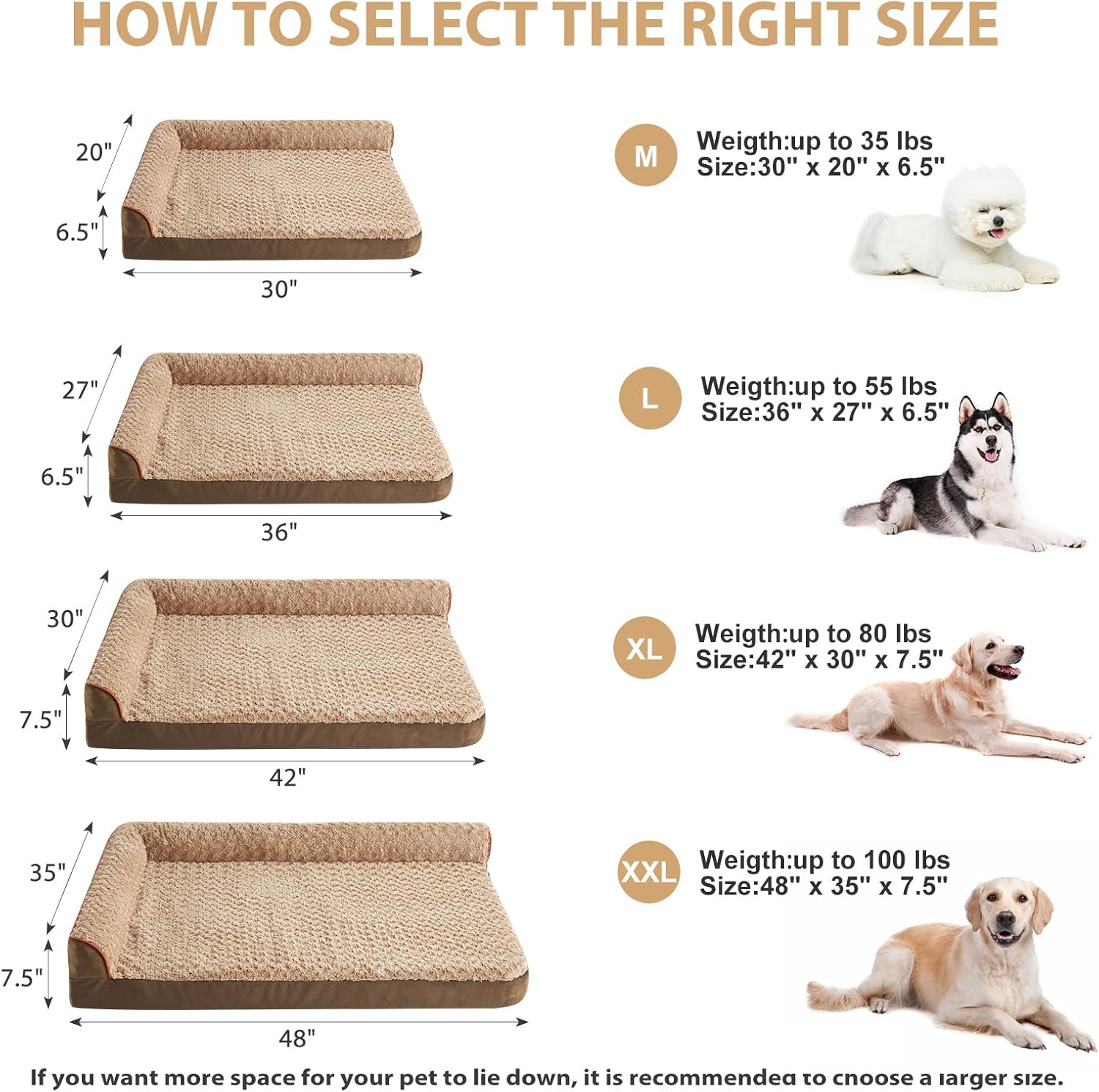 - SIZE(DOG BEDS FOR EXTRA DOGS): The dimensions of this XXL dog bed are 48“ x 35" x 7.5". XXL dog beds for extra large dogs up to 100 lbs. This orthopedic dog couch will give your pet more space and allow your friend to stretch out on the bed.
