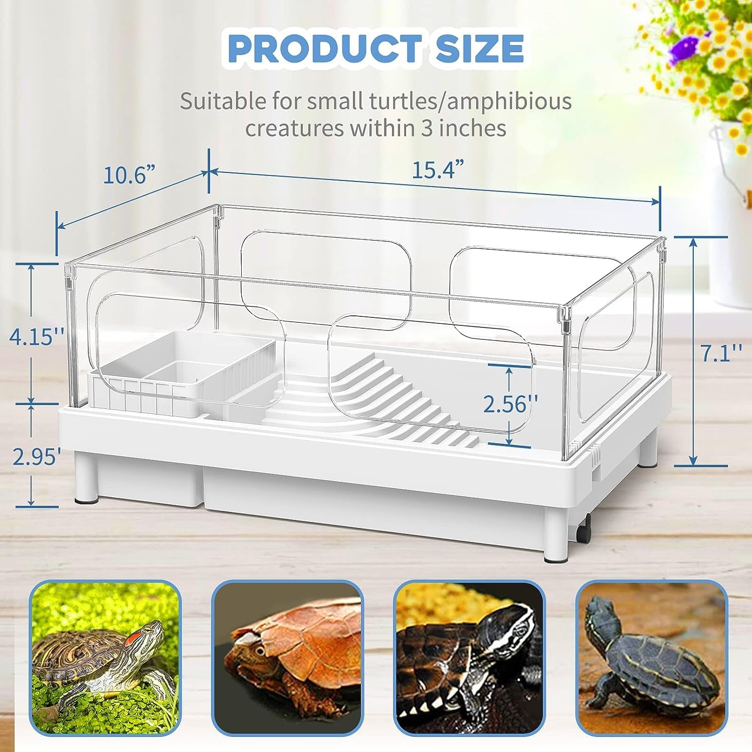 Small Turtle Tank Kit(Tank+Light+Filter), Acrylic Turtle Tank Starter Kit with Basking Platform, Bottom Drainage, Multi-Function Areas for Turtles, Crayfish, Small Reptiles.(White+Black)
