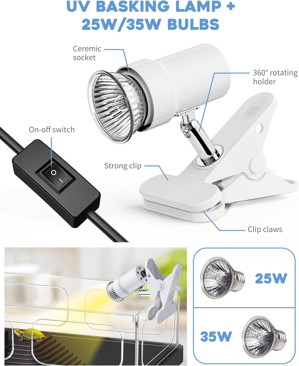 - ăUVA/UVB Basking Lamp + 25W/35W BulbsăTurtles need to bask in the sunshine everyday 1-2 hours for metabolism, mood regulation, breeding, etc. 25W/35W Bulbs provide best warmth within distance of 10ââ to 15ââ. Theyâre perfect for this small tank, not too hot not too cold.