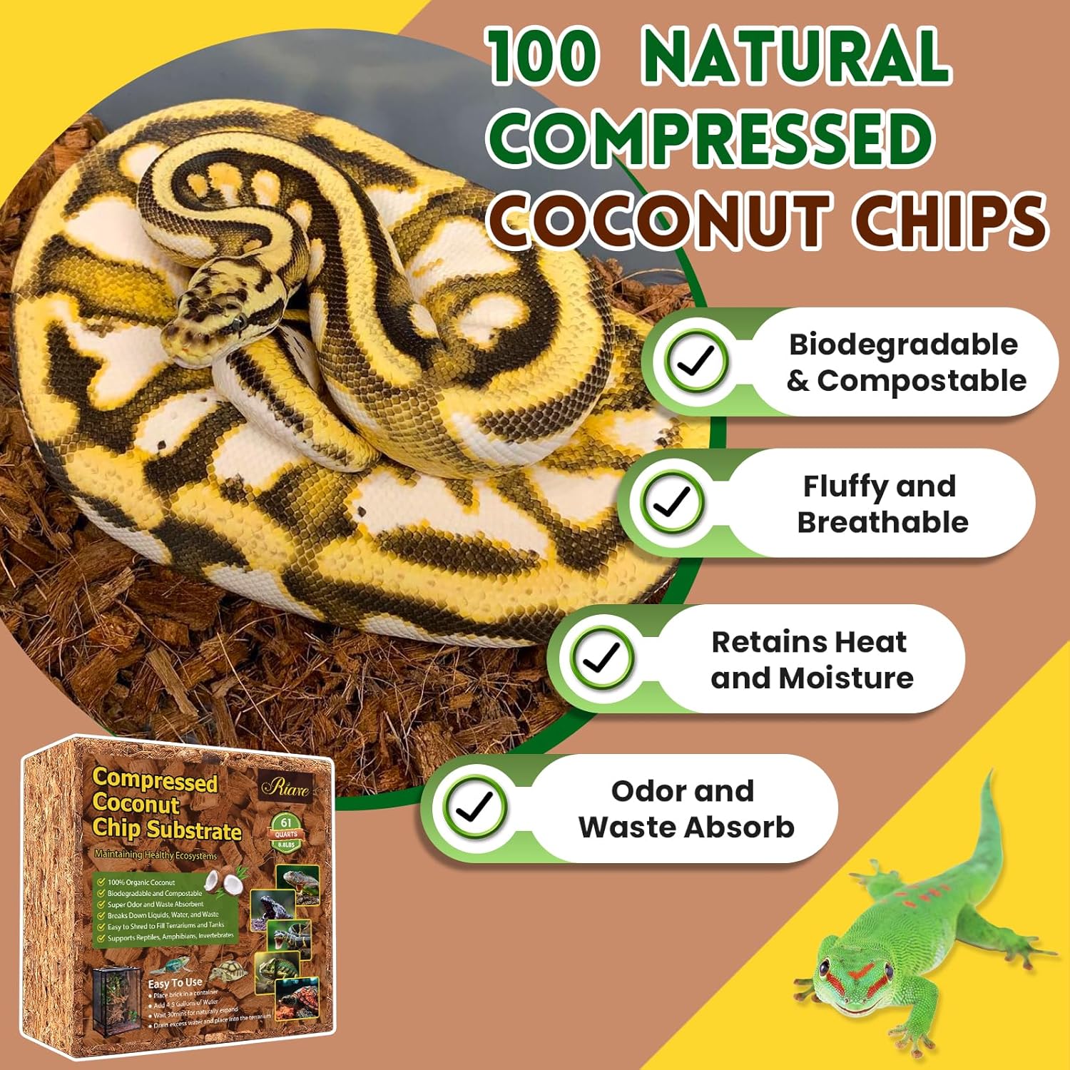 Riare 8.8LB Coconut Chip Substrate for Reptiles, 60 Quart Coconut Fiber Substrate Coco Chips Substrate Coconut Husk Bedding for Snakes, Tortoises, Ball Python, Bearded Dragon, Geckos, Lizards, Frogs