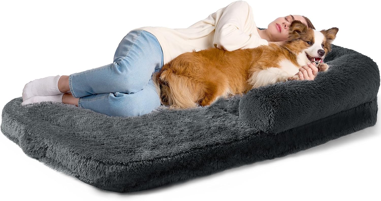 EHEYCIGA Human Dog Bed for Kids, Foldable XXL Dog Bed, Faux Fur Fluffy Pet Couch Bed, Orthopedic Calming Memory Foam Big Pet Bed, Washable Pet Sofa Bed with Non-Slip Bottom, Dark Grey, 54"x38"x7.5"