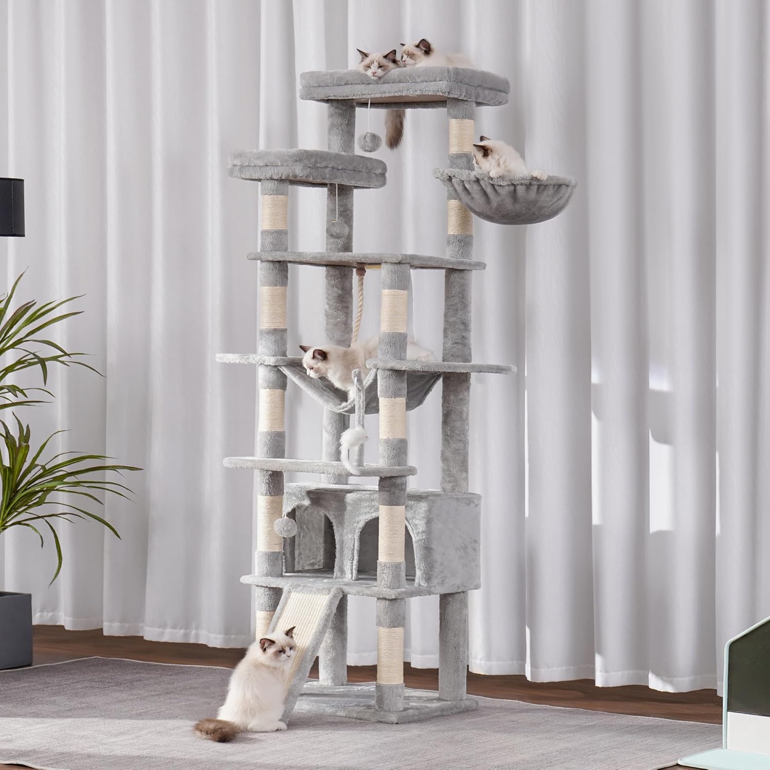 Heybly Tall Cat Tree, 78-inch Multi-Level Cat Tower for Indoor Cats, 2 Widened Plush Perches Cat Condo with Scratching Board and Big Caves, Light Gray HCT033W