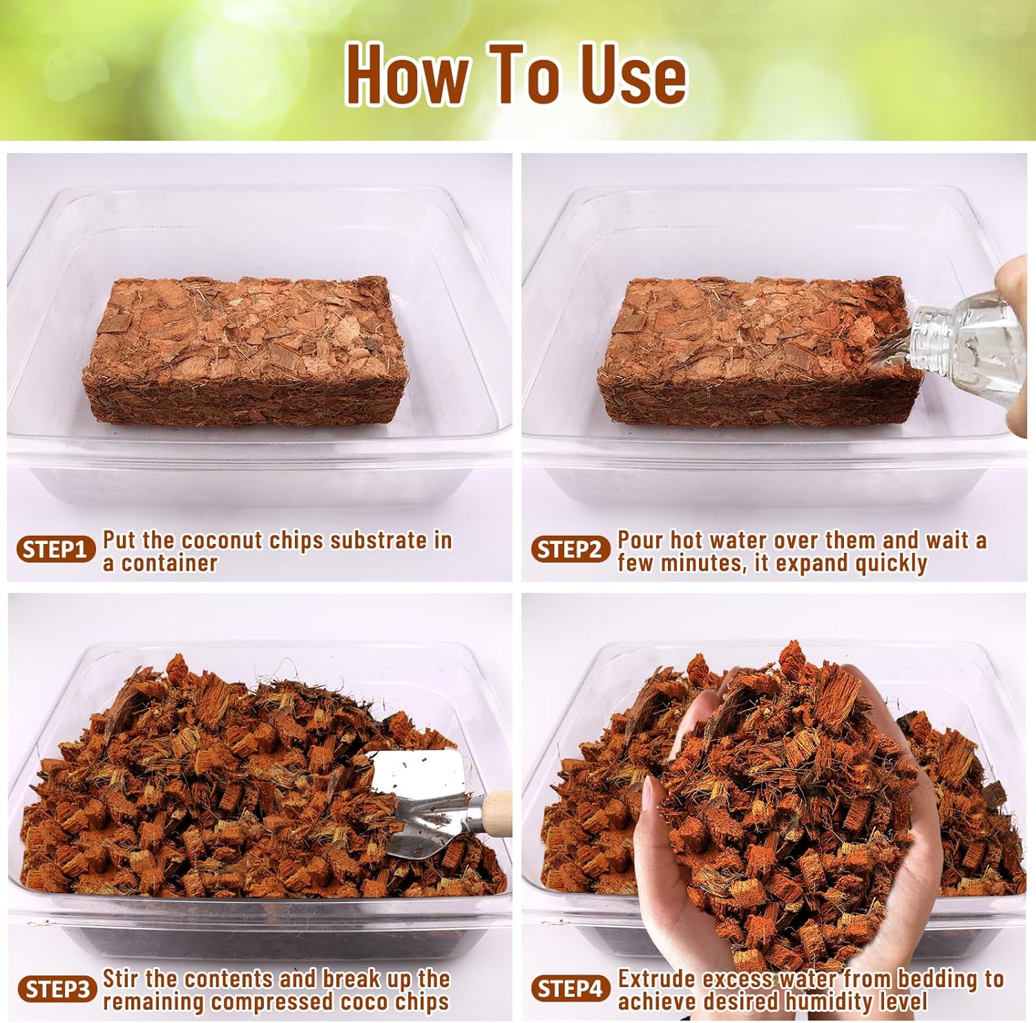 - Easy to Use and Store: Simply add water to expand and use, it can expand to several times its original size. Coconut chips are chunky, without other substances or impurities, no dust and sharp pieces, so you don't have to worry about scratching or cutting your pets skin. Compressed packages are easy to use and store. Each brick is 8.2Ă—4.1Ă—2.2 inch