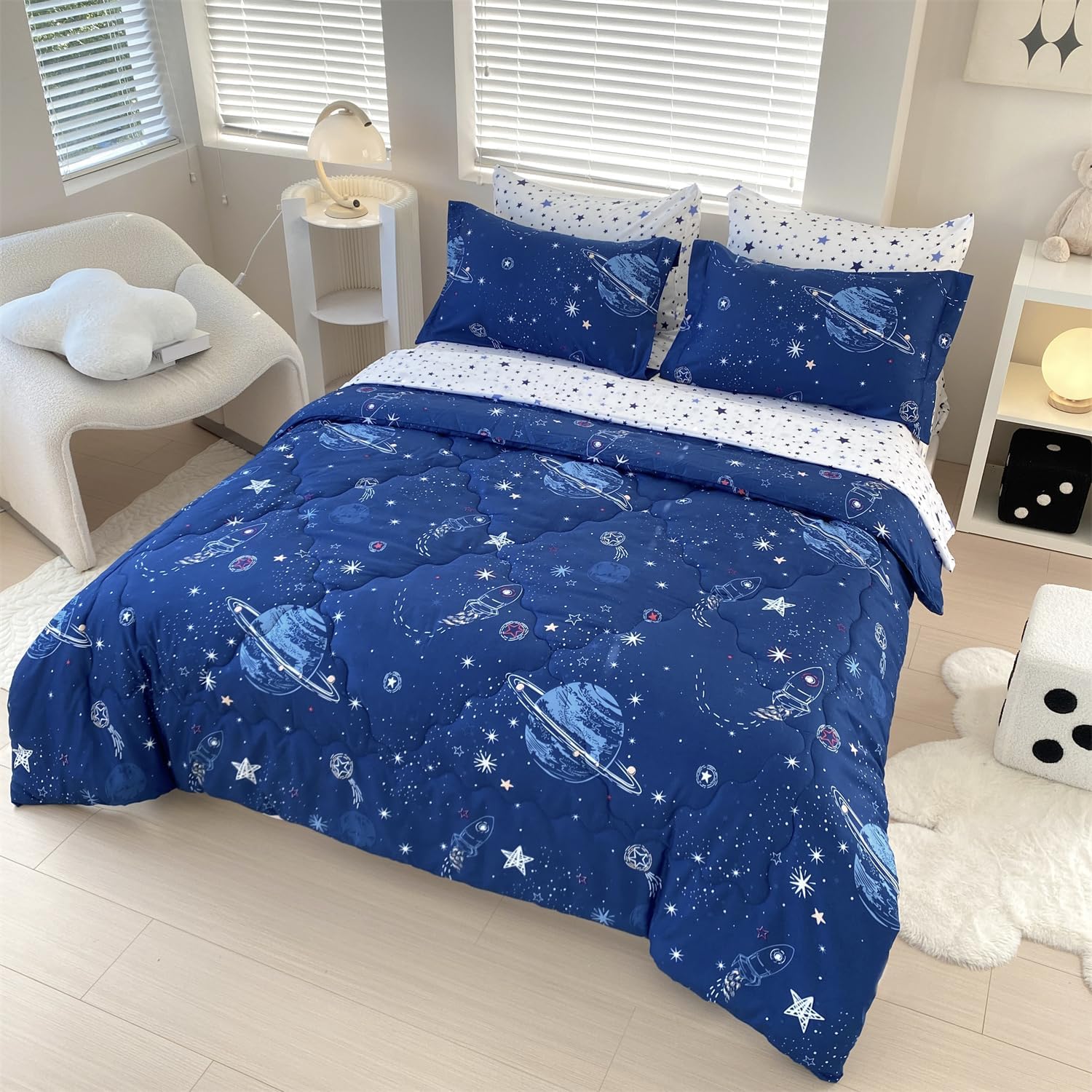 7 Piece Boys Space Comforter Set Twin Size Bed in A Bag Star Rocket Galaxy Universe Planets Bedding Set for Kids Teens Girls Microfiber Blue Quilt All Season