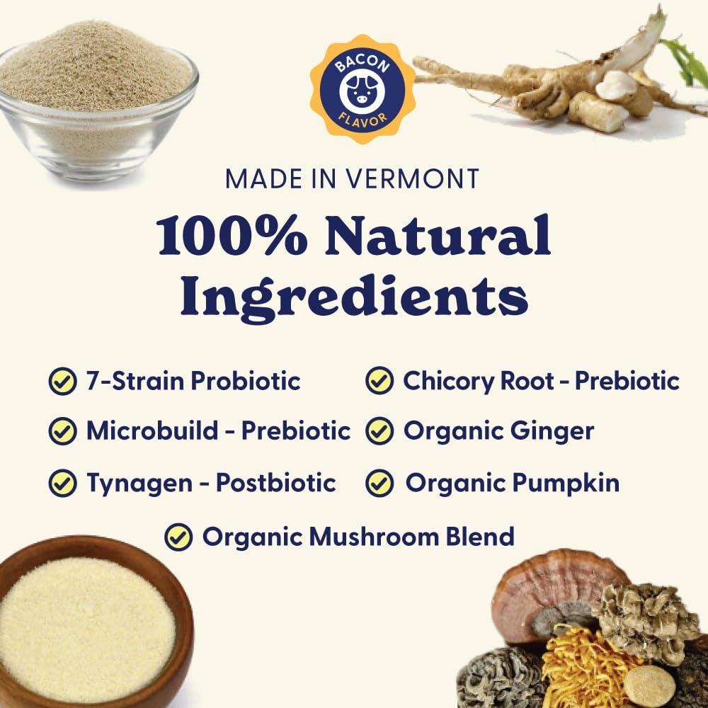 - 100% Natural Ingredients: Your dog deserves real ingredients. These bacon-flavored soft chews blend organic ginger root, organic pumpkin, organic mushrooms, yucca, and astragalus root into one irresistible chew. Free from soy, wheat, and artificial colors/flavors.