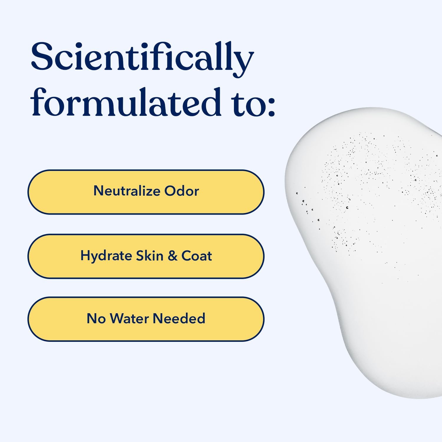 - Product Benefits : Cleanses, Neutralizes odors, Hydrates skin and coat, Nourishes skin, No water required, Free of parabens, sulfates, phosphate, DEA, MEA Cleanses, Neutralizes odors, Hydrates skin and coat, Nourishes skin, No water required, Free of… See more