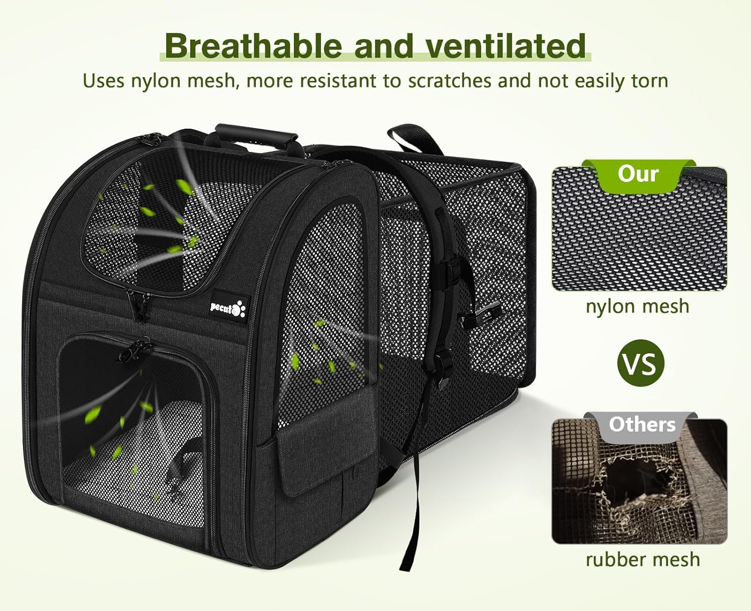 - ăEXCELLENT VENTILATION & VISIBILITYă: The backpack has upgraded four-sided mesh windows that offer added ventilation to maximize airflow. The top mesh opening allows pets to stick their head out, enjoy the scenery and interact with the outside world. Made of high-quality 300D Oxford cloth and nylon mesh fabric that is waterproof, anti-scratch, non-toxic, and non-irritating, lets your pet breathe freely and relax.