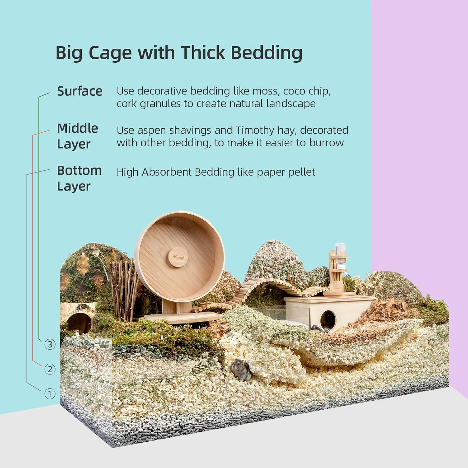 - [Soft Texture & More Comfortable] Niteangel tiny pet aspen bedding is made from natural Aspen wood and safe for small pets. The soft fluffy texture allows your critters to play freely on the aspen shavings bedding. The small pet bedding is not only good at absorbing the annoying smell of the cage, but also gives the hamster a natural and comfortable habitat.