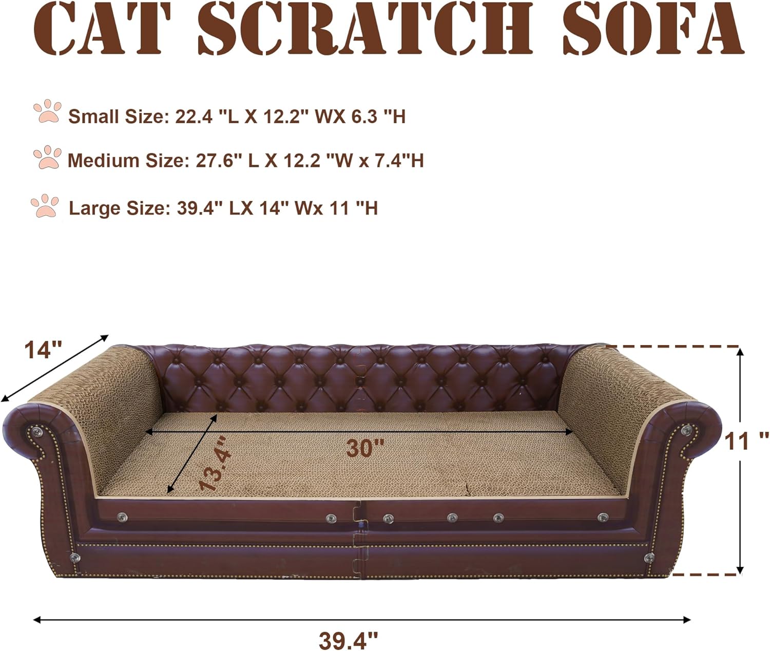 - Cat Scratch Sofa: The sofa cat scratching board is available in a variety of sizes and you can choose the right size for your cat. Dimensions :39.4"L X 14"W X 11"H. Cat couch bed has a lot of cat space, enough for multiple cats to sleep, play, roll around and scratch.
