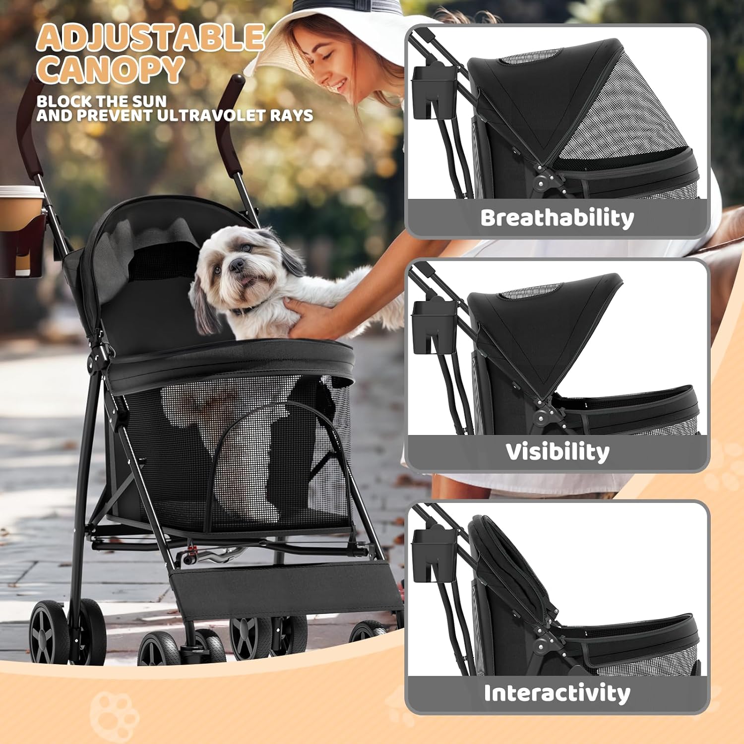 - Adjustable Comfort & Easy Access : This pet stroller features an adjustable canopy and breathable mesh windows for maximum airflow and shade. The spacious padded interior and dual-entry zippered doors let pets easily hop in or out, making every ride cozy and stress-free