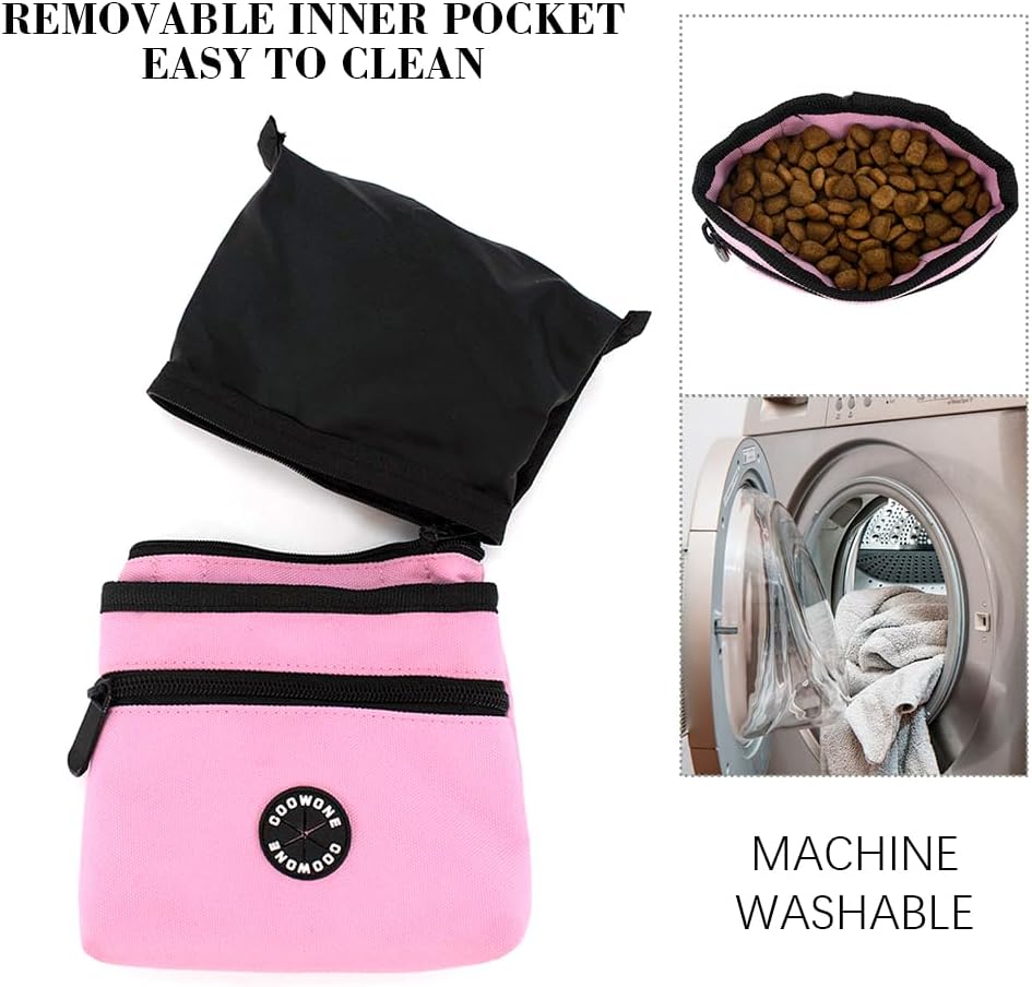 - REMOVABLE DESIGN: This small dog treat bag has a ring of zip on the inside and the lining is completely removable - no more worries about the dog food dirtying the bag and difficult to clean! Just gently unzip the inner zip, the inner pocket can be completely removed and hand washed or thrown directly into the washing machine for cleaning. Let your fury friends always enjoy clean and fresh treats!