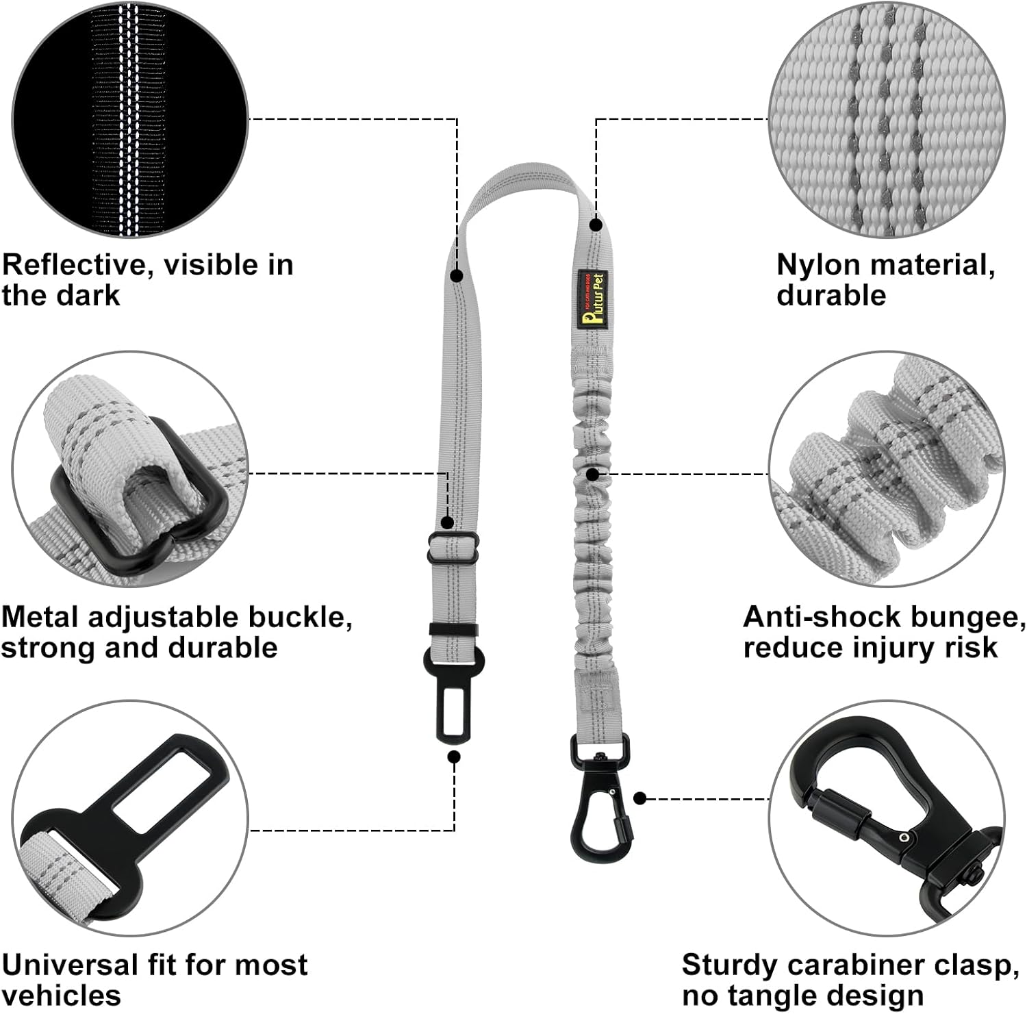Plutus Pet Dog Seat Belt for Car, Adjustable Dog Car Harness with Carabiner Clip, Reflective Safety Dog Seatbelt Leash with Elastic Bungee, Gray