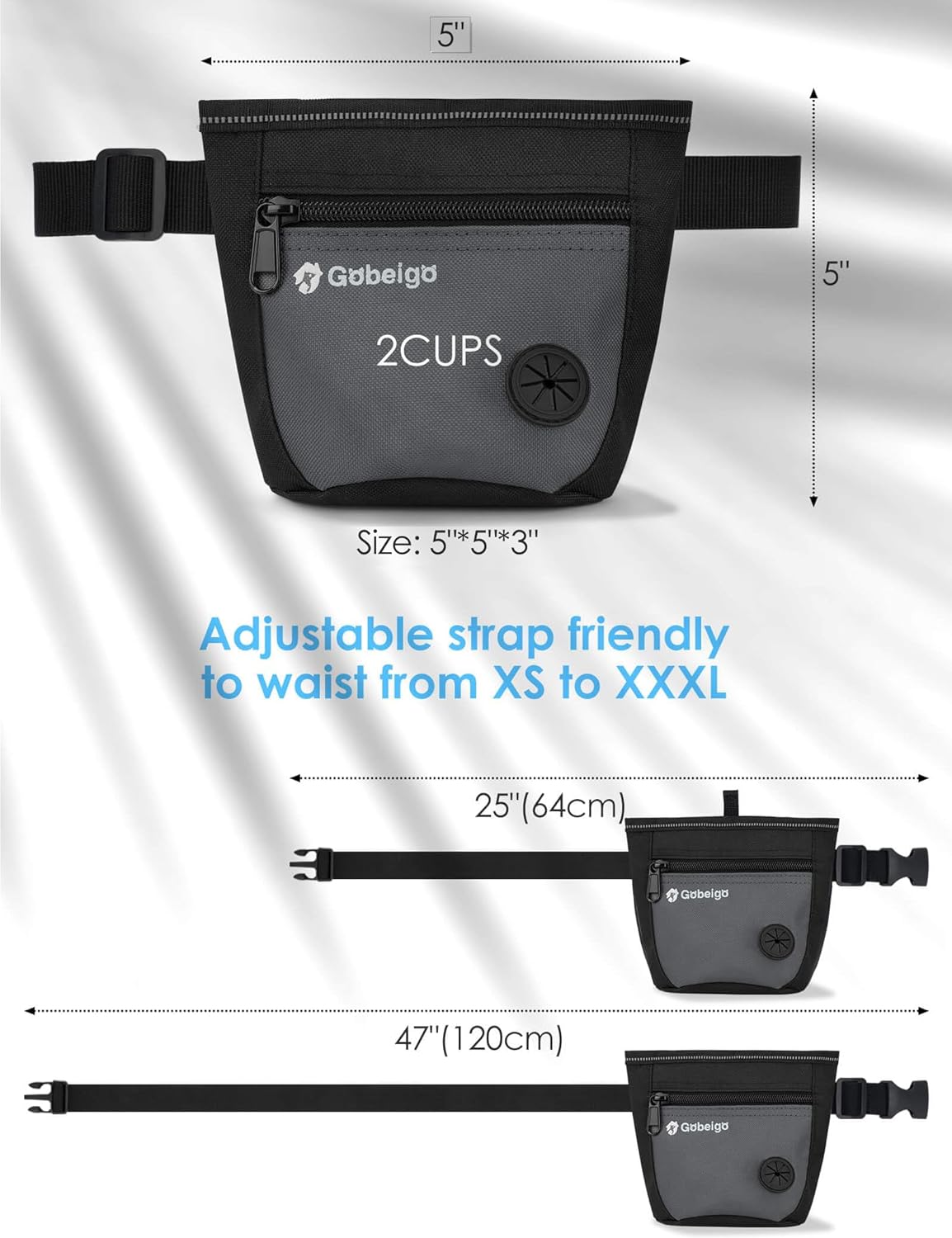 Gobeigo Dog Treat Pouch and Training Clicker, Upgrade Two Magnetic Closure to Prevent Spills, 2 Cup Treat Bag with Poop Bag Dispenser, Metal Clip Waist Belt Fanny Pack for Pet Walking (Black/Gray)