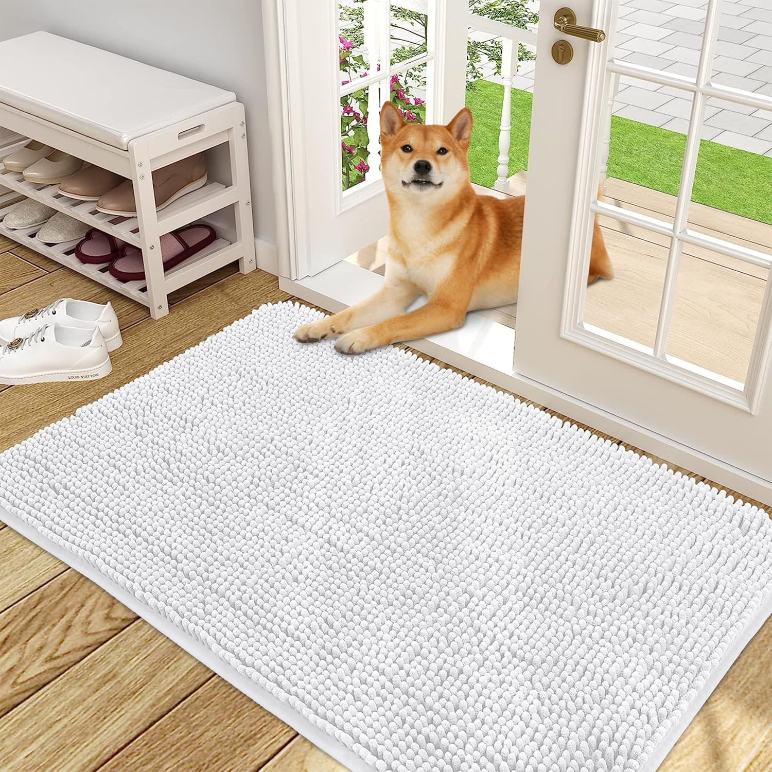 OLANLY Dog Door Mat for Muddy Paws 48x30, Absorbs Moisture and Dirt, Absorbent Non-Slip Washable Doormat, Quick Dry Chenille Mud Mat for Dogs, Entry Indoor Entryway Carpet for Inside Floor, White