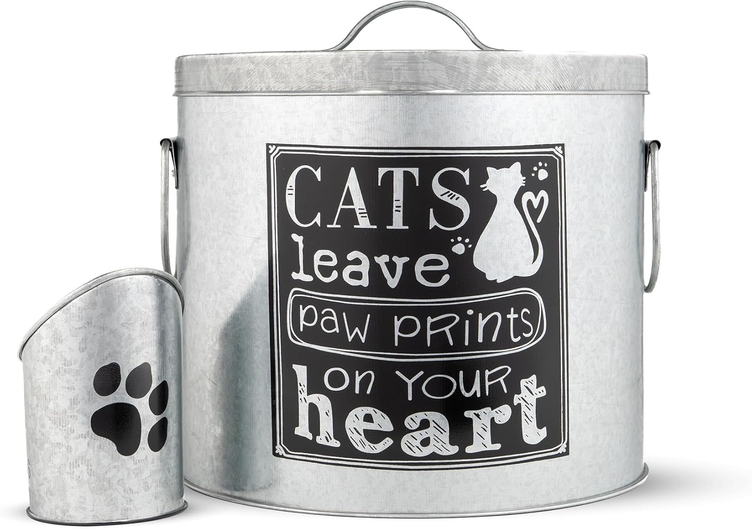 - BEAUTIFUL DESIGN: Modern, sturdy, but rustic cat food container used for pet food storage provided with a scoop for easy serving. Your cat will love watching you open the tin canister in anticipation!