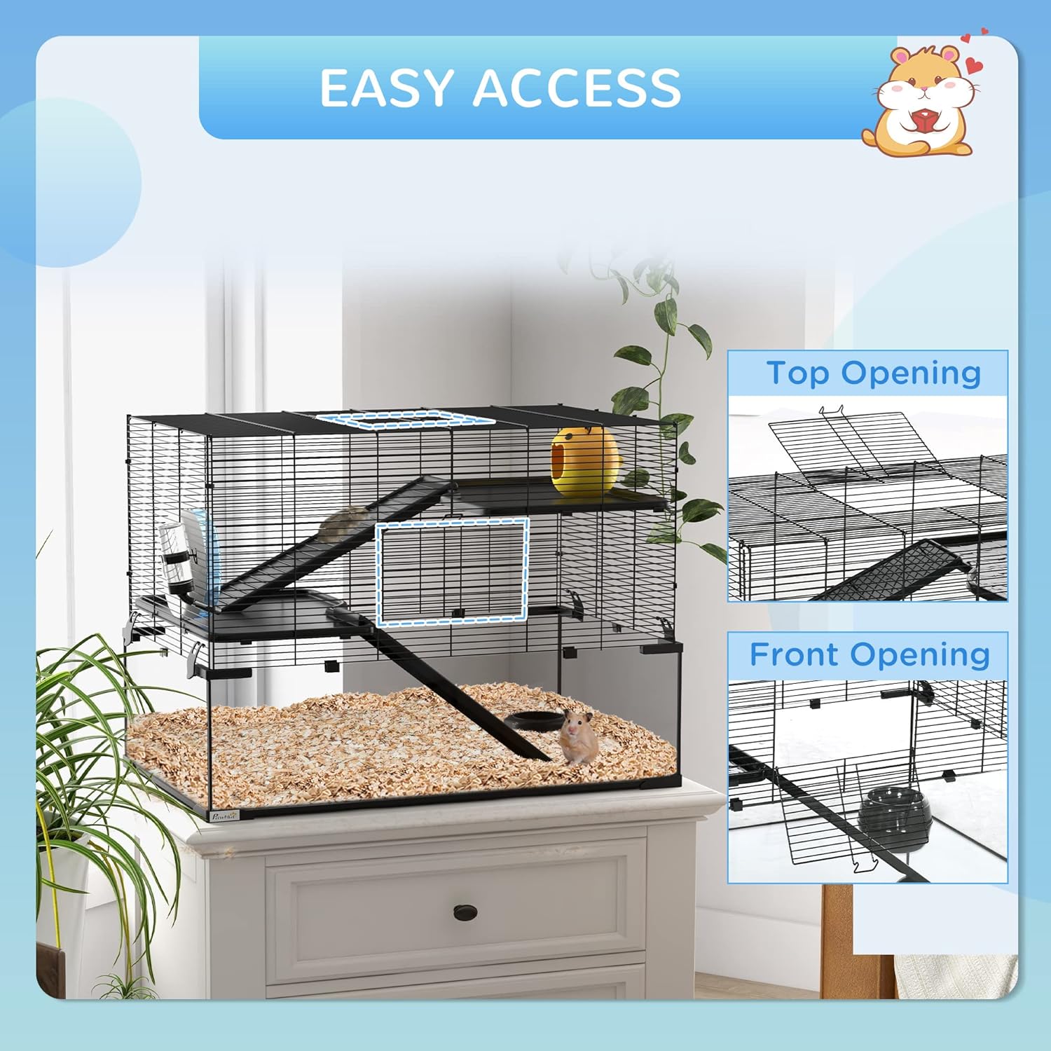 - Easy Cleaning and Access: The big hamster cage's frame attaches to the glass bottom with clips, making disassembly quick and cleaning hassle-free. A front door and a top opening provide easy access to your pet.
