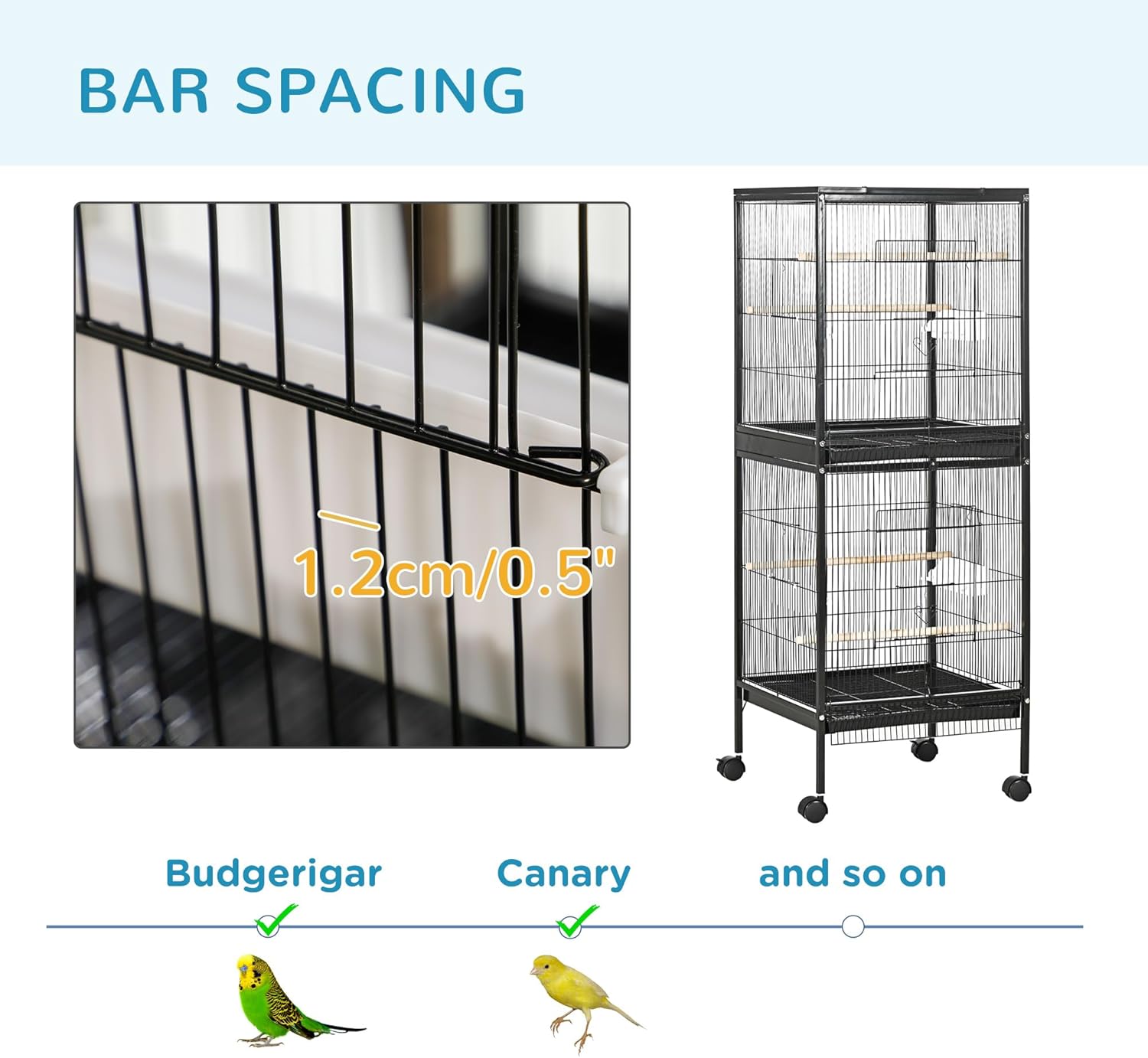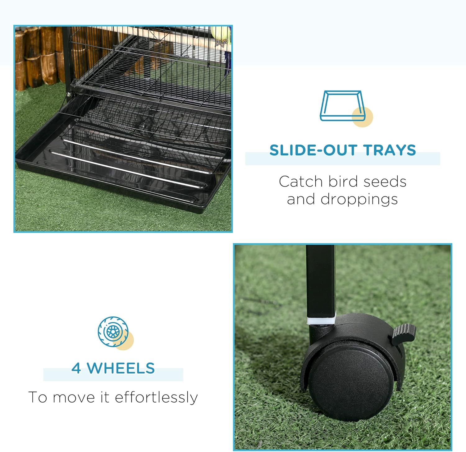 - Easy Rolling: With swift-rolling, quick-to-shift-around movement, this cage for birds can be rearranged effortlessly when it's in the way. The metal wire structure is a four-wheeled friend of portability.