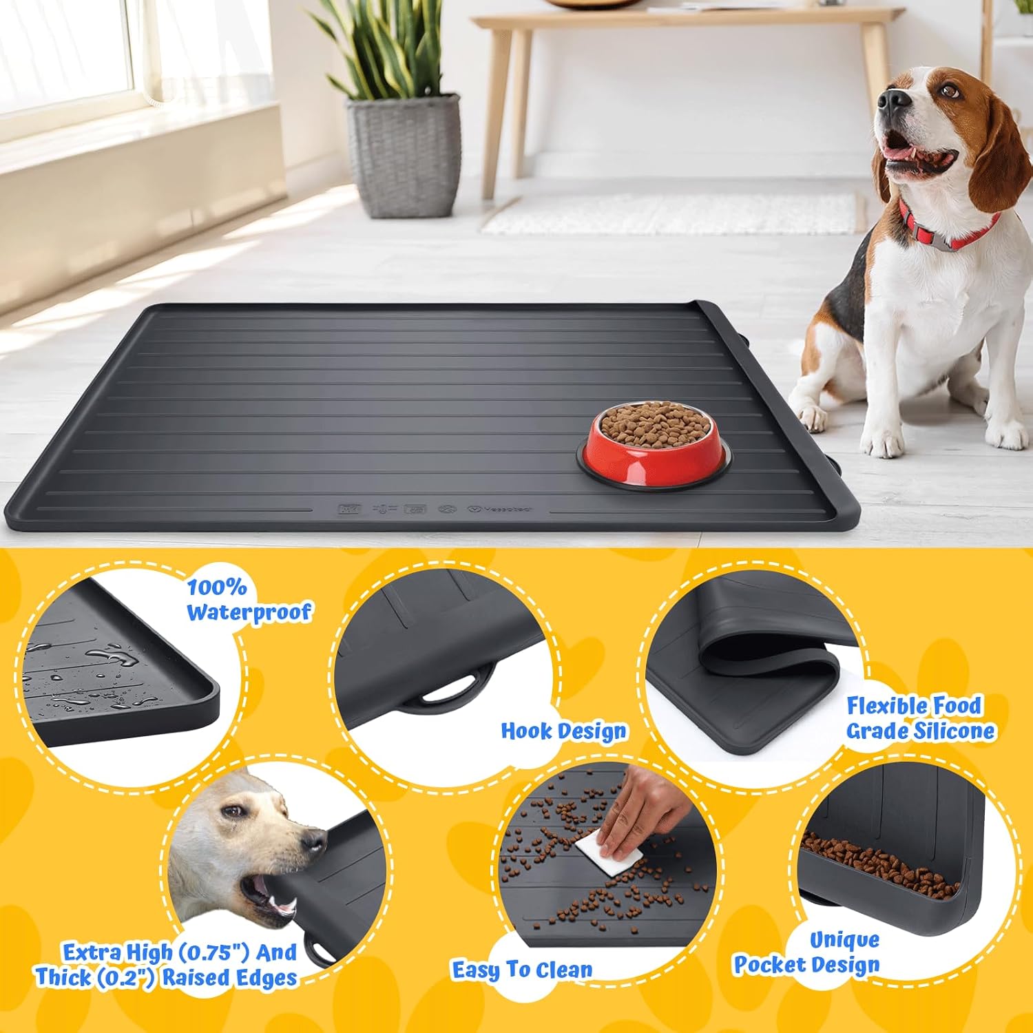 - WATERPROOF AND EASY TO STORE: Our dog food mat is made of high quality silicone material that is 100% waterproof, and is easily dried with a damp rag or rinsed with water. It also does not leave any water marks after drying. The silicone dog food mats are soft, flexible, and can be folded or rolled up to save space. The hook design allows for easy hanging to dry after washing, keeping the mat clean and dry at all times.