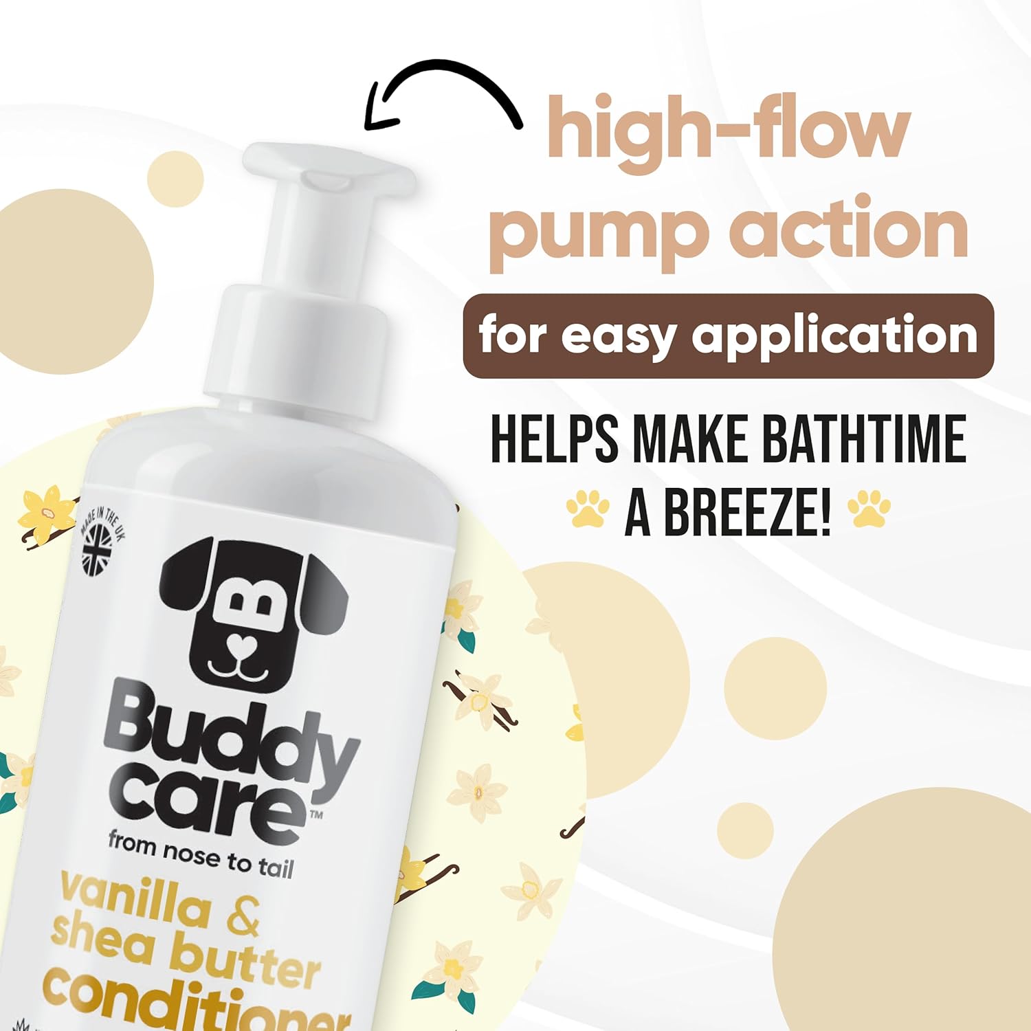 - SOOTHING DOG CONDITIONER – Buddycare soothing, detangling vanilla and shea butter dog conditioner works alongside our range of dog shampoos and is the ideal final step in your pet’s grooming routine. Simply massage into your dog’s wet fur after our cleansing dog shampoo, focusing on the matted and tangled areas. Rinse thoroughly with warm water and towel dry for a clean, comforting vanilla scent and silky-soft finish.