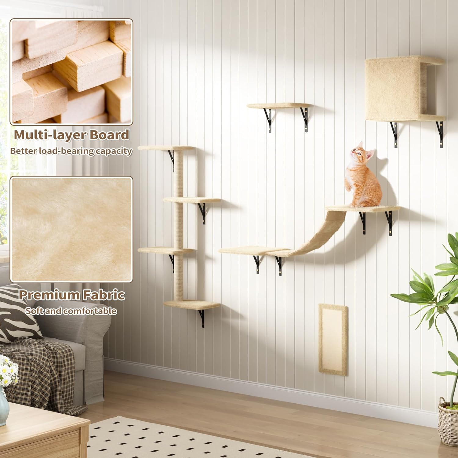 COZIWOW Wall Mounted Cat Furniture, Cat Wall Shelves and Perches, Floating Cat Shelves for Wall Set of 5(Beige)
