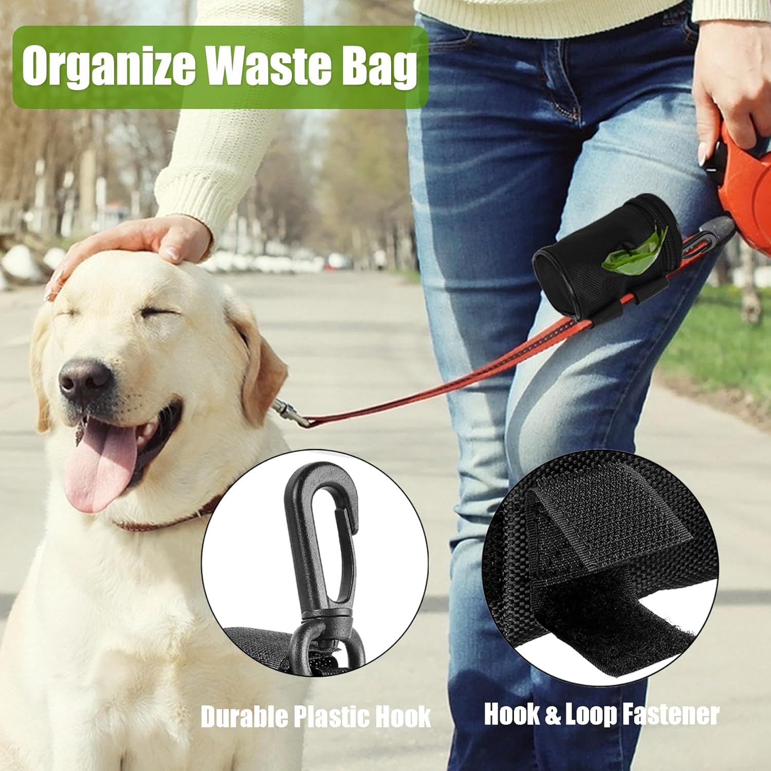 - [ Hand Free Walking Set ] A new great leash attachment set for your dog walking. Enjoying hand free walking without carrying the unused dog poop bags on hand and holding wasted poop bag. This practical set includes ONE Dog Poop Bag Dispensers (Storage Dog poop bags / Bag holder), ONE Dog Poop Bag Holders & ONE Rolls Waste Bags