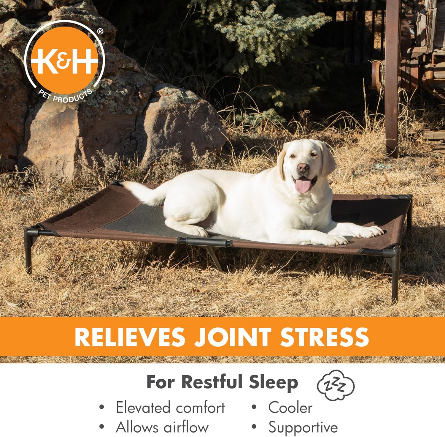 K&H Pet Products Outdoor Elevated Dog Cot, Breathable Cooling Elevated Cot Hammock Pet Bed for XL Dogs, Washable Mesh Cover, Raised Metal Frame, Collapsible, Portable - Jumbo 56 X 38in Chocolate