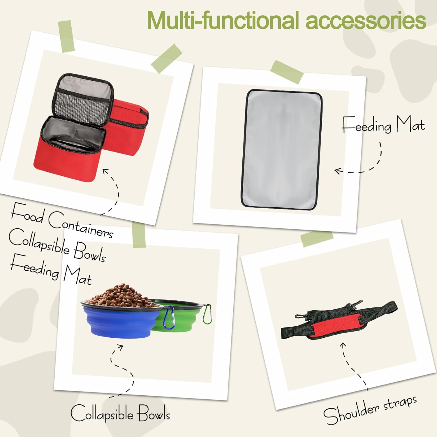Dog Travel Bag,Weekend Pet Travel bag Set for Dog and Cat,Airline Approved Tote Multi-Function Bags for Traveling,Include 2 Collapsible Bowls,2 Food Storage Containers,1 Feeding Mat,Red