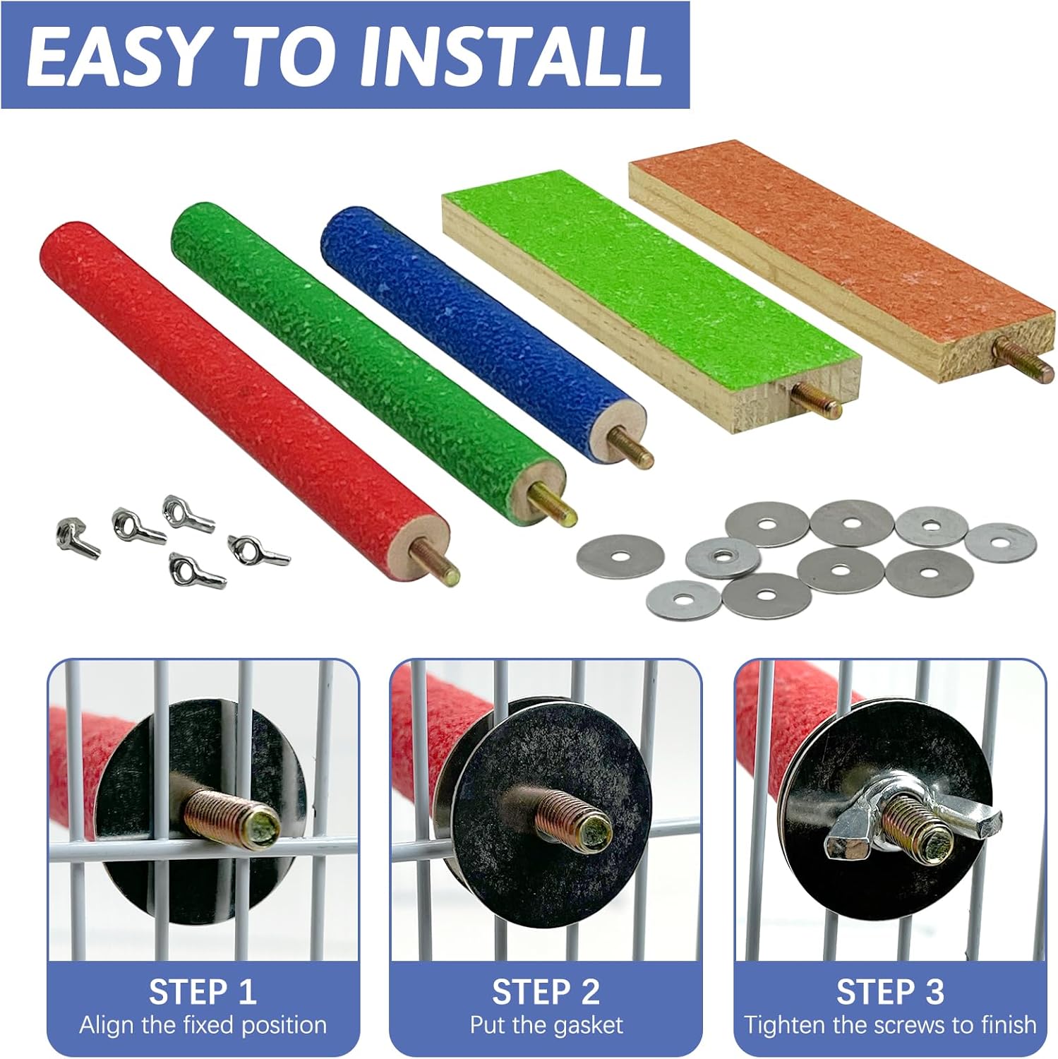 - EASY TO INSTALL : Our colorful bird platform is easy to install, no additional equipment is needed for installation, just loosen the nut of the stand pole, remove the spacer, place the stainless steel screw into the gap between the two wires of the bird cage, install the spacer, and then tighten the stainless steel nut. The flat parrot stand platform is equipped with metal wing nuts, bolts and washers, easy to hang in the cage, not easy to fall, the bird perch can be firmly fixed. Convenient for birds to play freely. It is the best bird toy for parrots