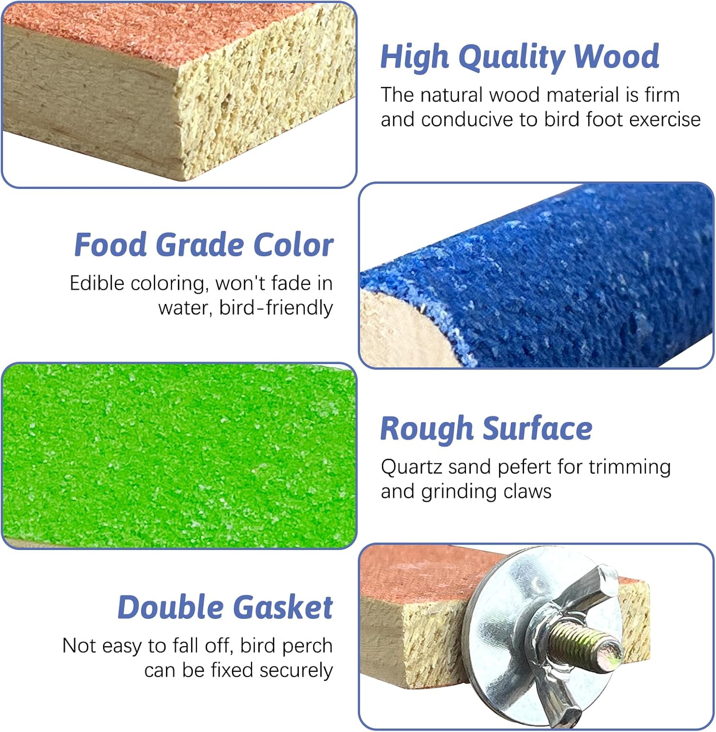 - SAFETY WOOD MATERIAL : All parrot perch toys are made of high quality wood and quartz sand with edible coloring, these bird perch platform will not fade in water and are bird friendly. Screws, bolts and washers are made of stainless steel, strong and reliable, not easy to rust or deform, can be used for a long time. TIP: Bird toys will smell like processing materials after long time sealed transportation. We recommend that you place the bird toys in a ventilated area for one to two nights before use to reduce the odor of the bird perch toys