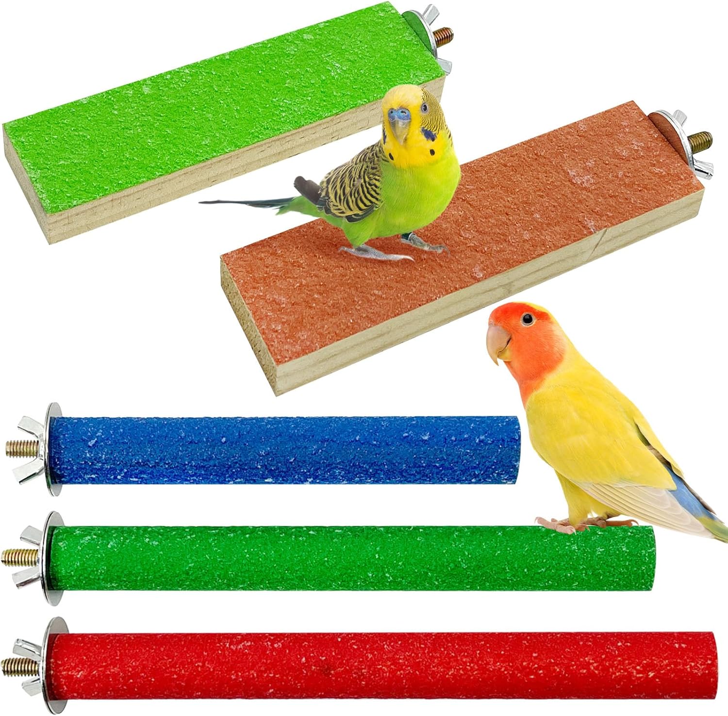 - HAVE FUN :Parrots can jump and play freely between the different colored perches and planks, relieving irritation and boredom increasing activity levels and reducing foot cramps and pressure sores. Your lovely bird can rest, play and sleep on the platform. Bird perch stand provide a comfortable place for your pet to play and exercise. You will receive three wood birds perches (Random color), two Rectangular wooden perching platforms, one Metal Accessories, enough number of wooden perching platforms for daily rest and recreation for your birds