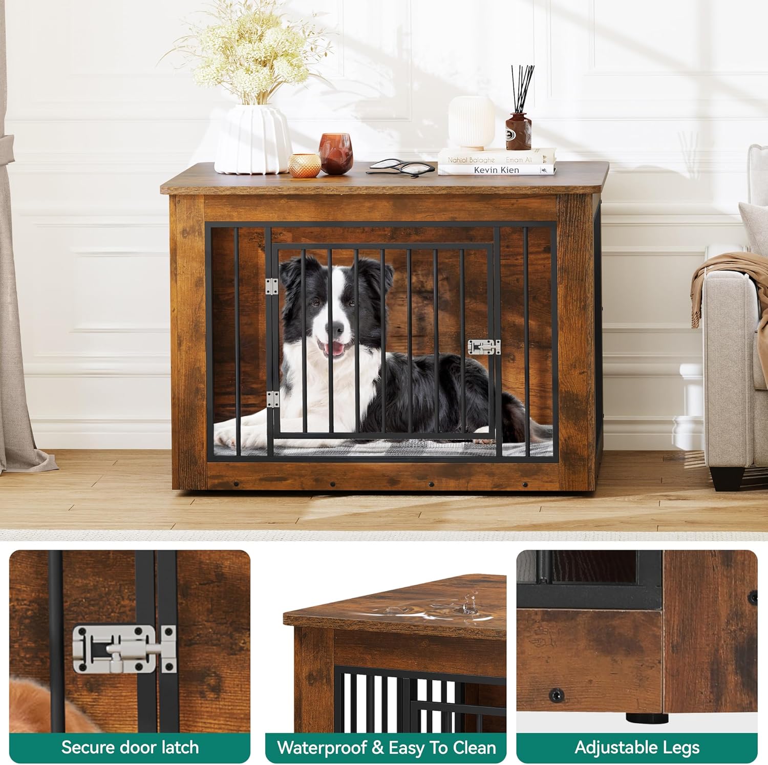 - Iron-Wood Fusion: The large dog crate combines a 15mm square tube and 15mm chipboard for added solidity and durability; This fusion promotes both strength and aesthetic appeal; The rustic brown finish blends well with any home decor, making it a versatile addition to your living space