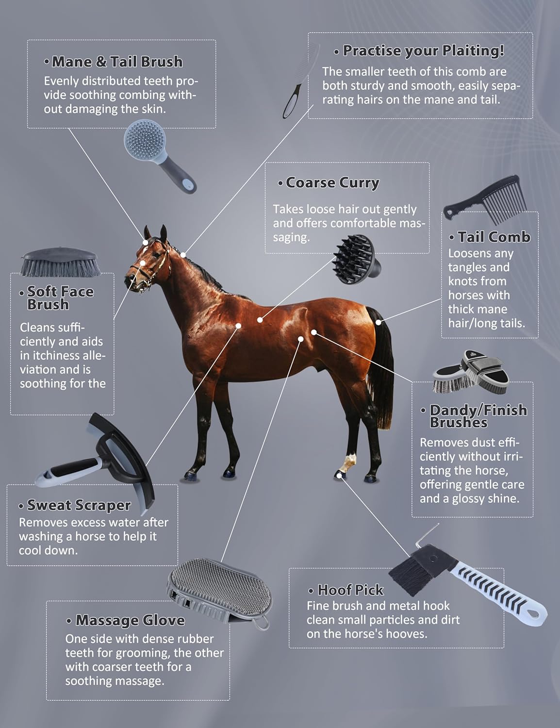 - Durable & Long-Lasting: Made from high-quality materials, the brush set features premium plastic construction with special wear-resistant treatment, ensuring exceptional durability that far surpasses ordinary brushes. These horse brushes effectively remove dirt from the horse’s coat, stimulate blood circulation, and promote natural oil production for a smooth, glossy coat.