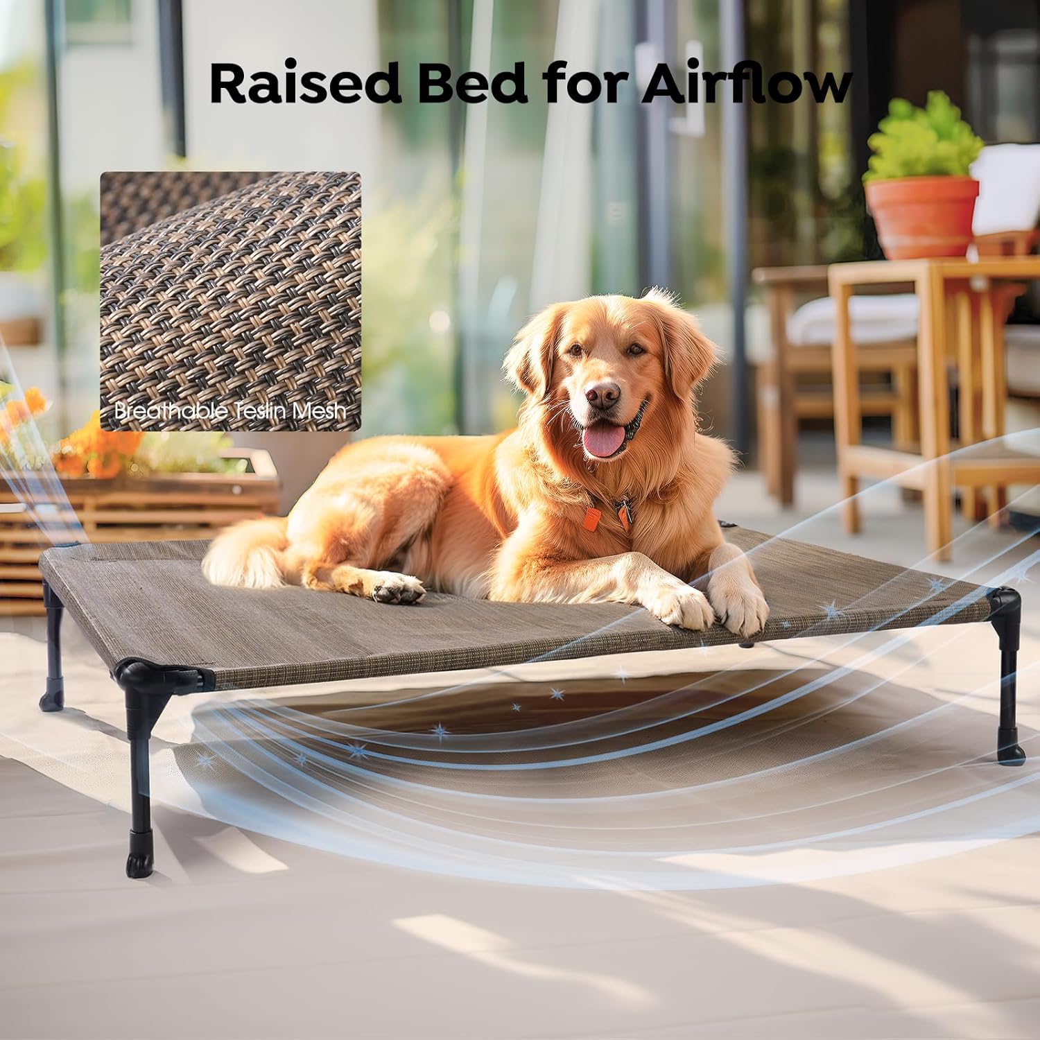 - Stay Cool Ever! Crafted of mesh fabric in the center, our raised dog bed allows air to flow, keeping them cool while they relax in the heat. Textilene fabric features heat-resistance, sturdy, and breathable.