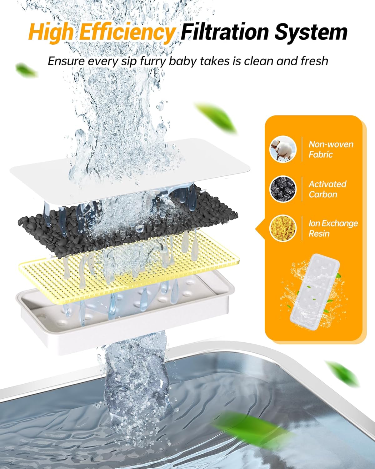 - 【Every Drop Trustworthy】Our large dog water fountain is equipped with an efficient filter system. Comprising layers of non-wover fabric, activated carbon and ion exchange resin, this multi-stage filtration system captures pet hair, food residue, and saliva, providing water that is oxygen-rich and tastes better. Ensuring your pet drinks clean, fresh water can help prevent urinary and kidney diseases. We recommend replacing the filter every two weeks for optimal performance