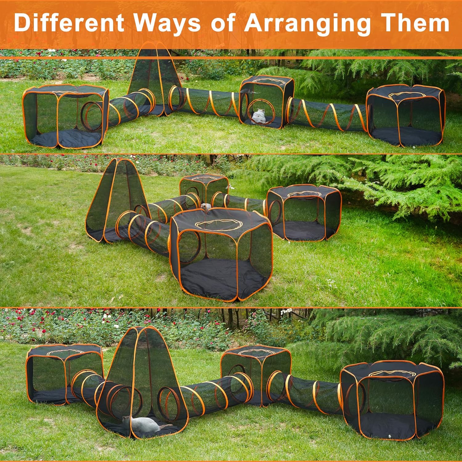 - 【Easy to Clean and Storage】 The tent and tunnel are made of mesh water-resistant, which is easy to clean and clean. After cleaning, it can be folded and put into the storage bag, which is very convenient to carry and store. It only takes 3 minutes to complete the cat play center. Build and store. Perfect for your backyard, porch, balcony outdoor camping site