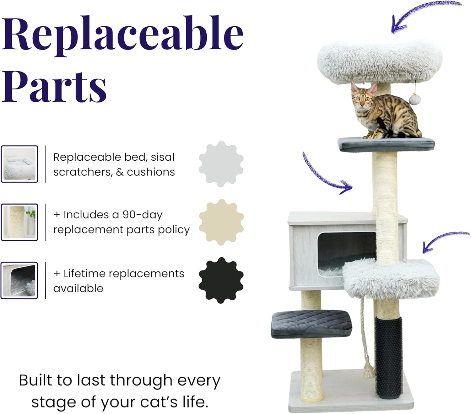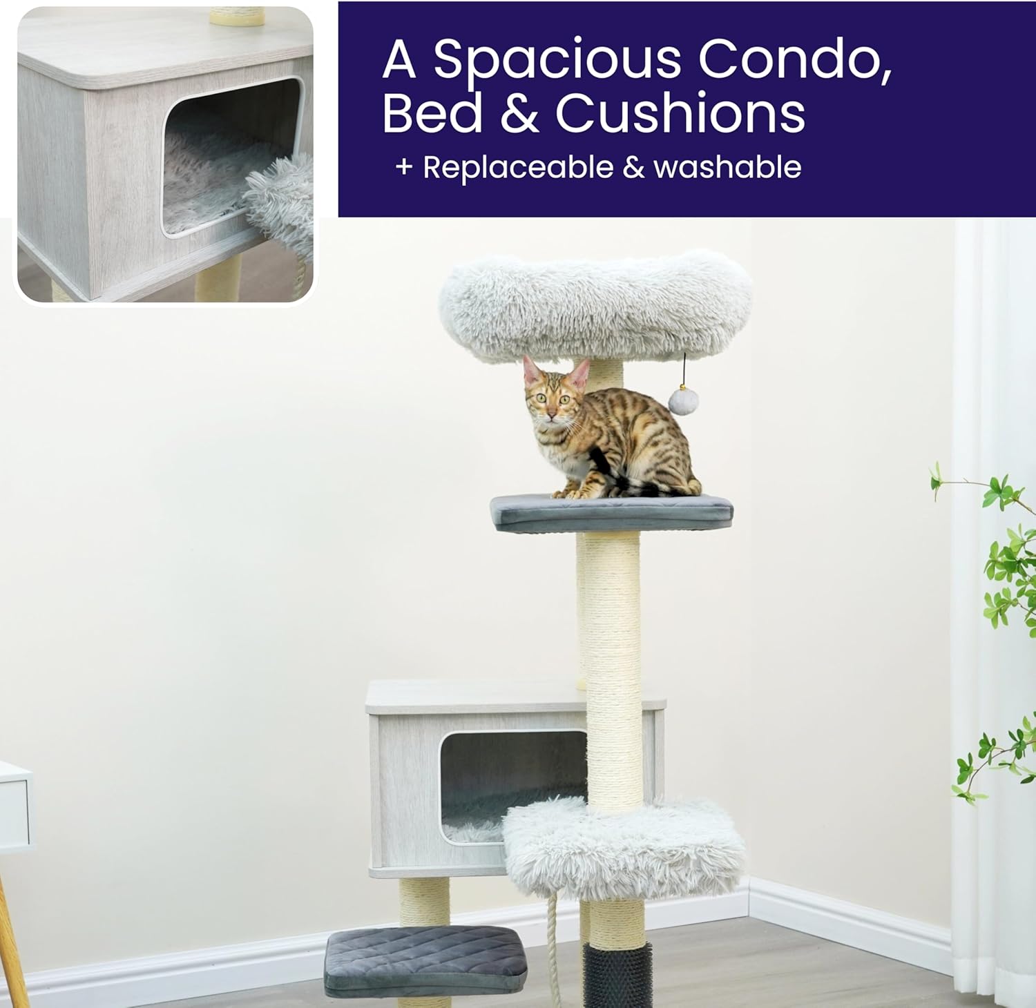 Catry Kasio 6 Level 54" High Modern Cat Tree with Laminated Wood Condo,Replaceable Scratching Posts,Removeable Washable Beds, Self Grooming Brush and Toys.(Light Gray)