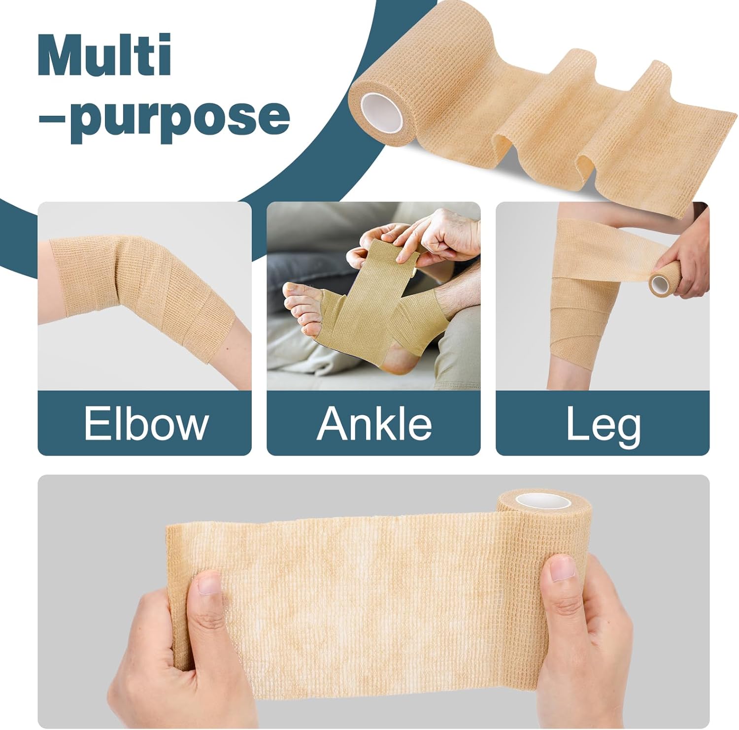 - Self Adhesive Bandage: Package includes 9 rolls of skin color self adhesive bandage wrap. Each roll measures 4 inch wide and 5 yards long after stretching. It easily adheres to itself but will not stick to other surfaces such as skin or hair, making it easy to pull off and change bandages