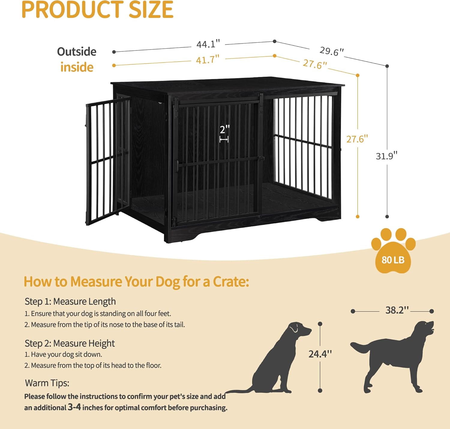 - How to Choose Size: Internal size 41.7L x 27.6W x 27.6H inches, this dog crate is fit for medium dogs like Border Collies, Poodles, and Bulldogs. Choose as your needs