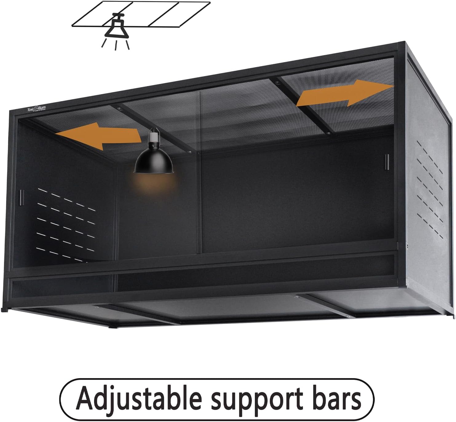 - ăHeat Humidity Retention and Top Ventilationă: The side panels of ToxiRium Reptile Terrarium are made of PVC material, which helps keep heat and humidity. The top screen mesh provides great ventilation, and two crossbars can be moved in parallel, enabling you to adjust the position of the hanging heating light or UVB reptile lamp. 1 cm raised bottom to facilitate the mounting of a reptile substrate heater