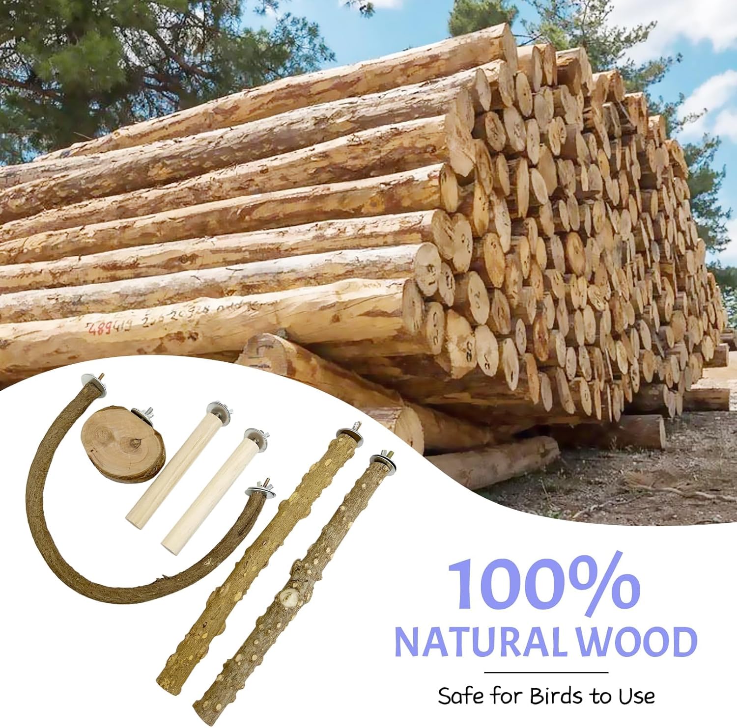 - Natural Wood Material: The bird stand in this set are made from 100% natural wood that are durable, paint-free and odor-free to provide a safe, natural place for your feathered friends to stand. Each parrot cage perch has an unsanded, rough-textured surface that allows the bird's feet to easily grip the perch, helping to avoid slips and falls,exercising the feet and sharpening their claws