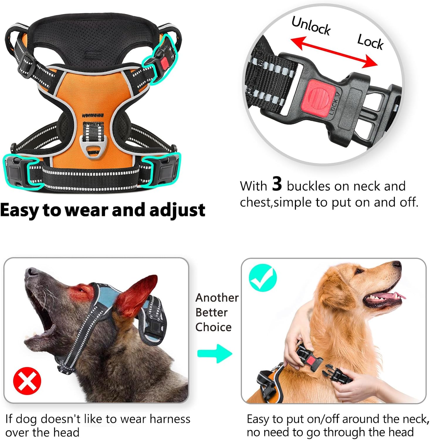Timos Dog Harness Large Sized, No Pull with Neck Lockable Snap,No Choke Front Clip Dog Reflective Harness,Adjustable Metal Rings 3 Buckles,Easy Control Handle for Large Dogs Orange L