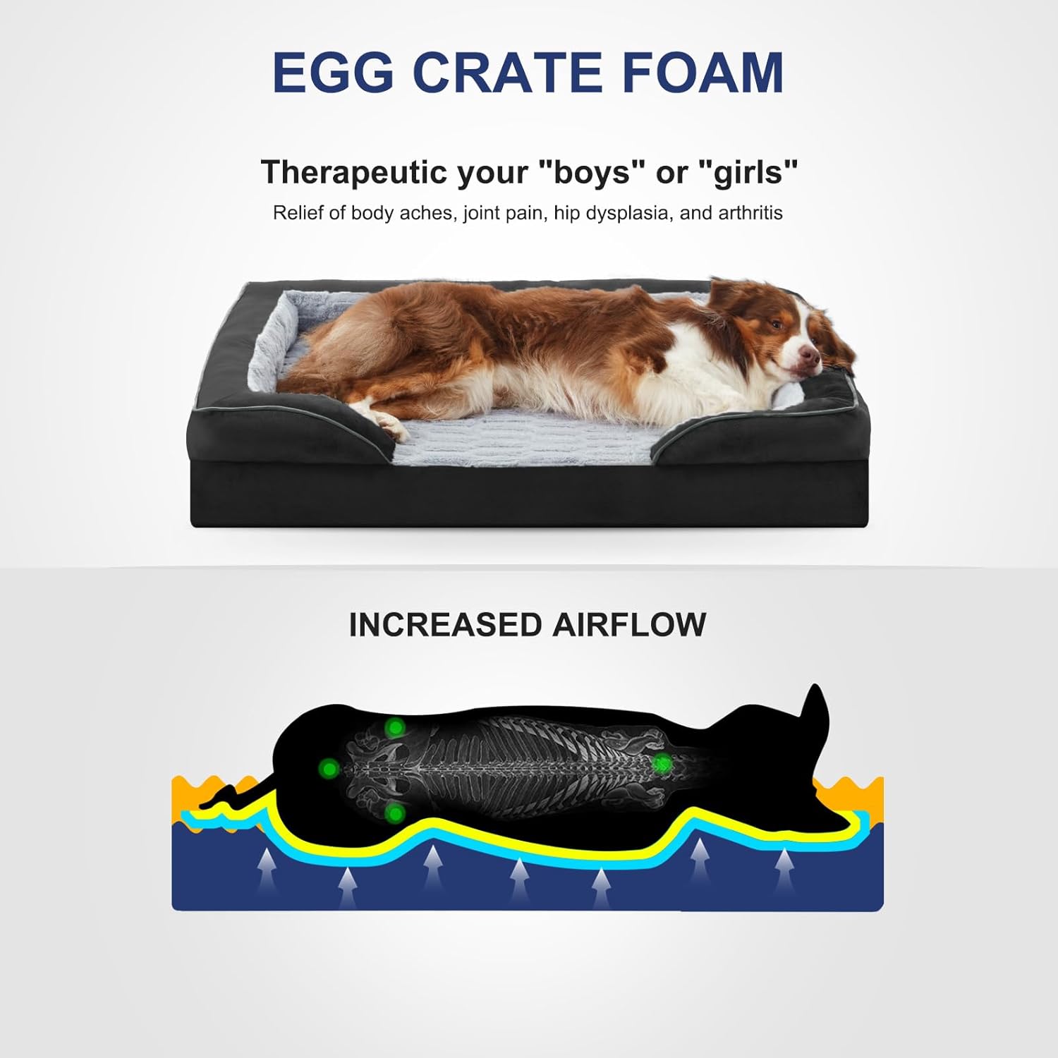 - Orthopedic Support: Our orthopedic dog bed features high-density egg foam to relieve pressure points, helping to evenly distribute weight and providing great support for painful joints and muscles. While fluff-filled bolsters support the neck, back, hips, and joints; helps ease discomfort and promote restful sleep.