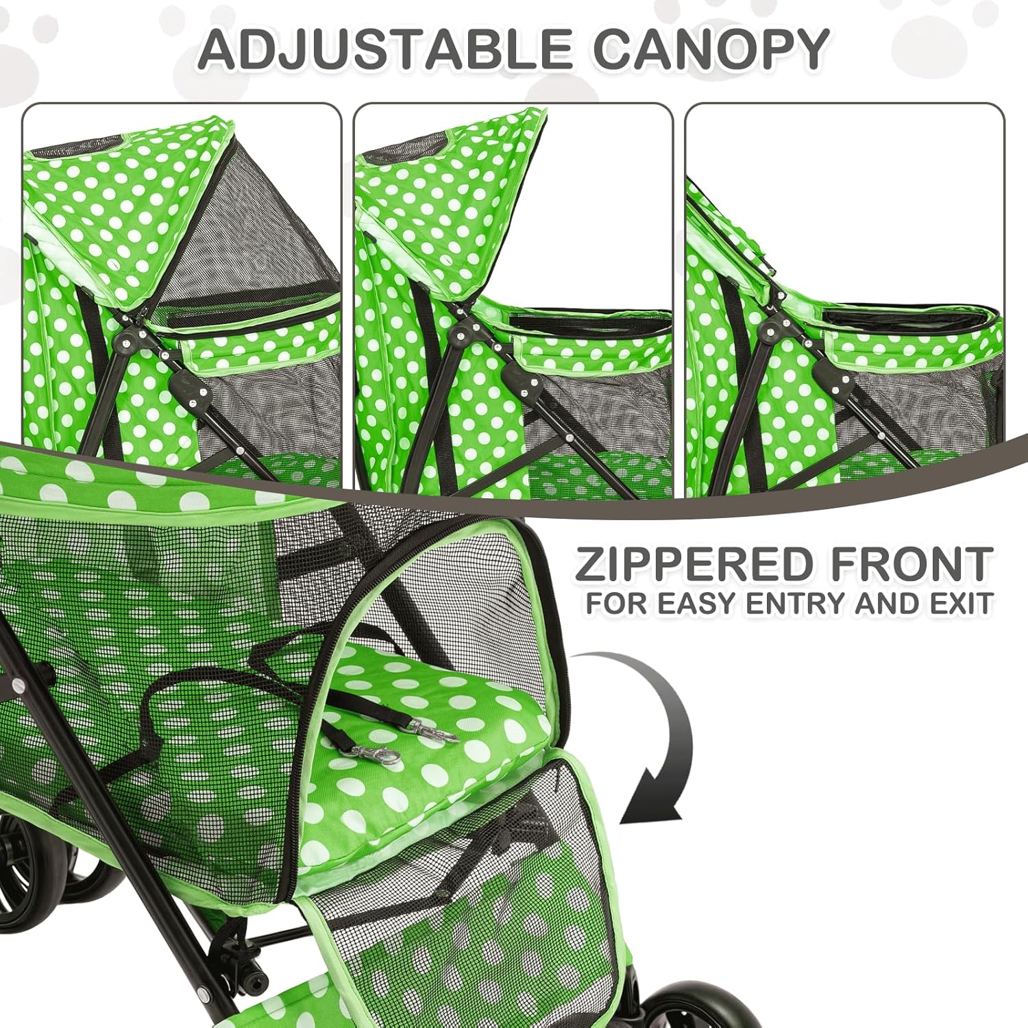 MoNiBloom 4 Wheels Pet Stroller, Easy-Fold Umbrella Shaped Dog Cat Jogger Stroller w/Storage Bag & Visible Mesh for Small/Medium Dogs Cats Lawn Green Polka Dots