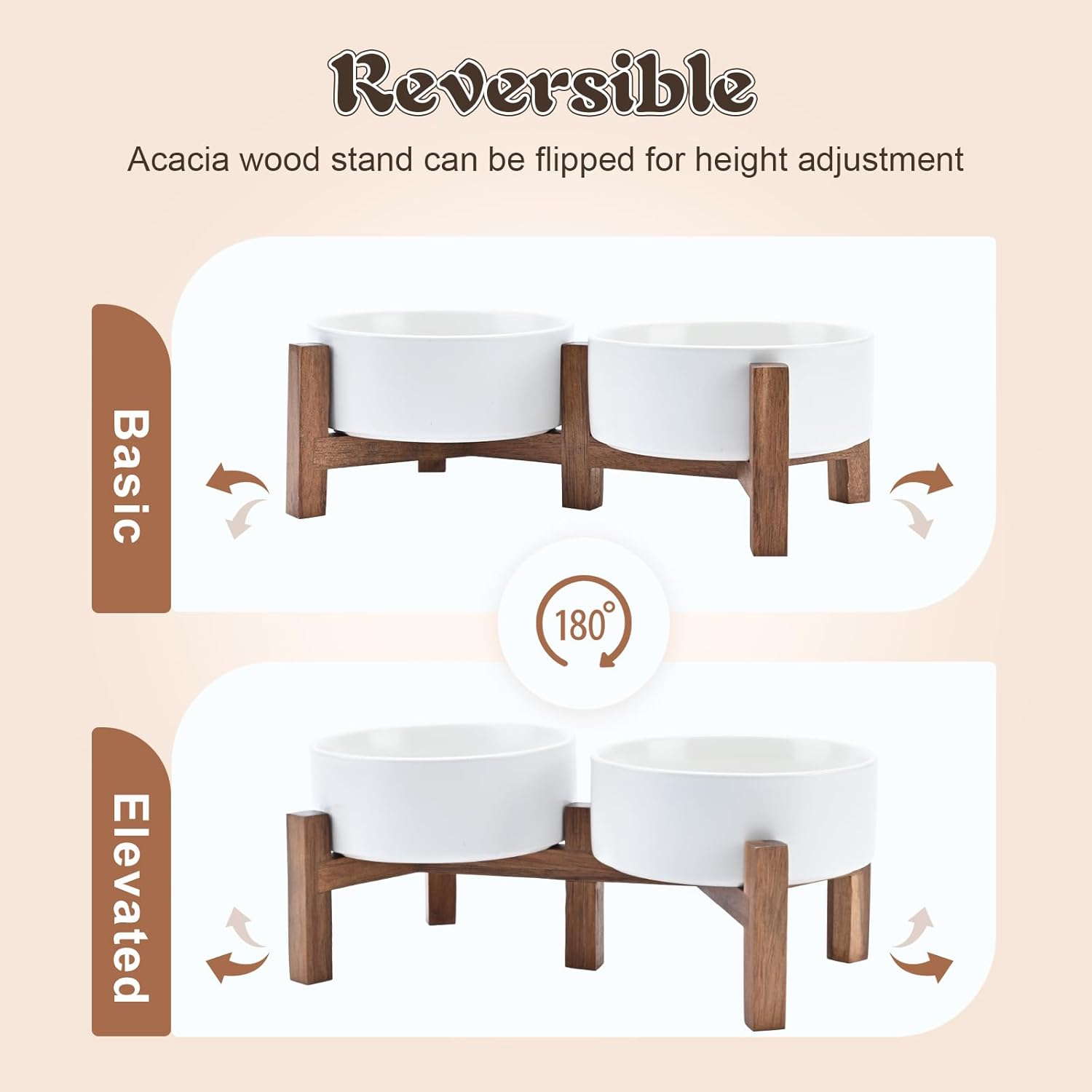 - UPGRADED ACACIA WOOD SHELF: Compared to the usual wood stand, this feeding bowl uses higher quality acacia wood, which not only enhances the overall stability and durability, but also the natural wood grain and warm tone of the wood stand can beautify the home space. The acacia wood stand has better durability and maintains a stable temperament even in humid environments