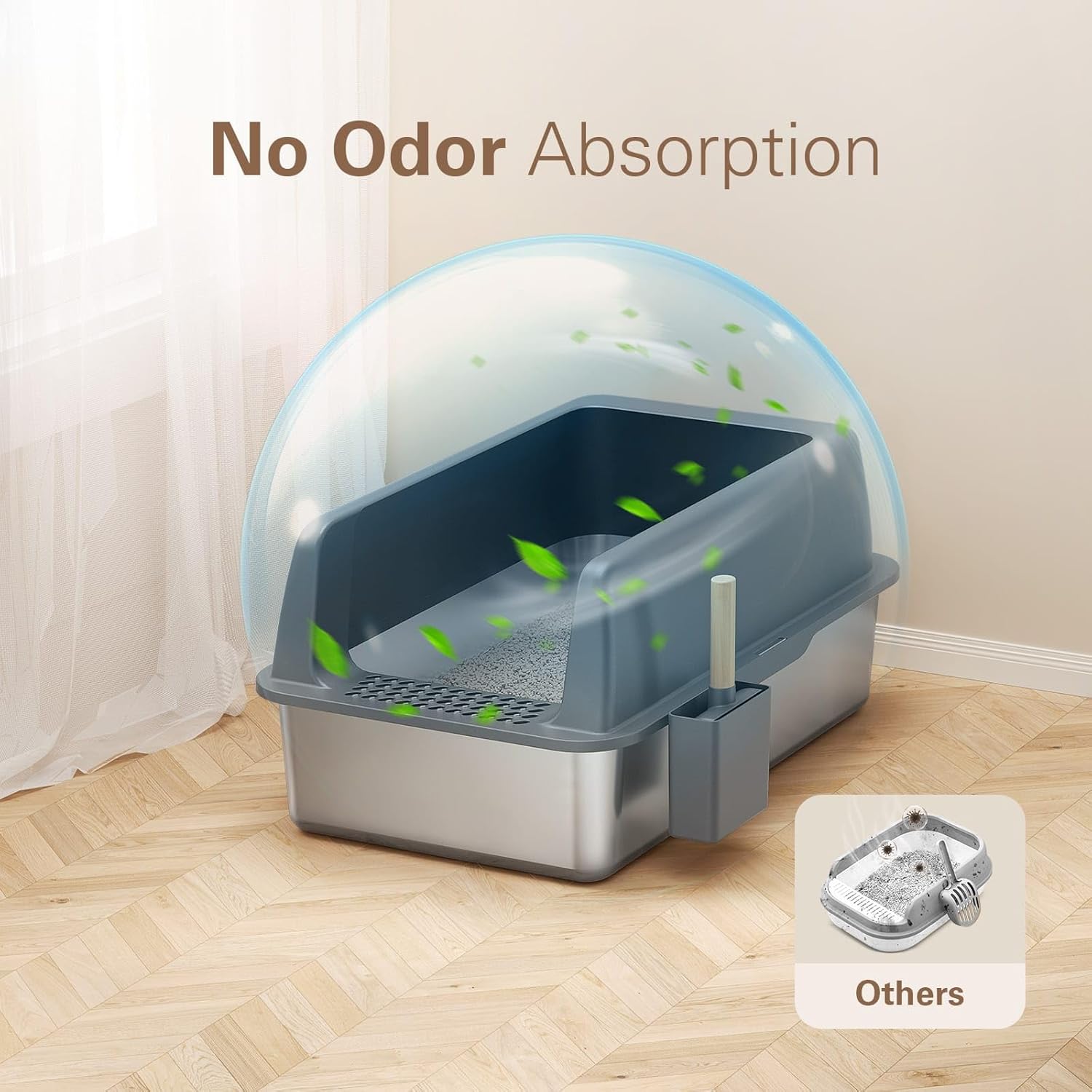 - ăSturdy Stainless Steel Buildă: Constructed from thick stainless steel for added durability, the stainless steel litter box is designed to withstand daily use, resisting rust and scratches from cat paws. The non-porous nature feature of stainless steel litter box also prevents odors from lingering, extending the lifespan and reducing the need for frequent replacement.