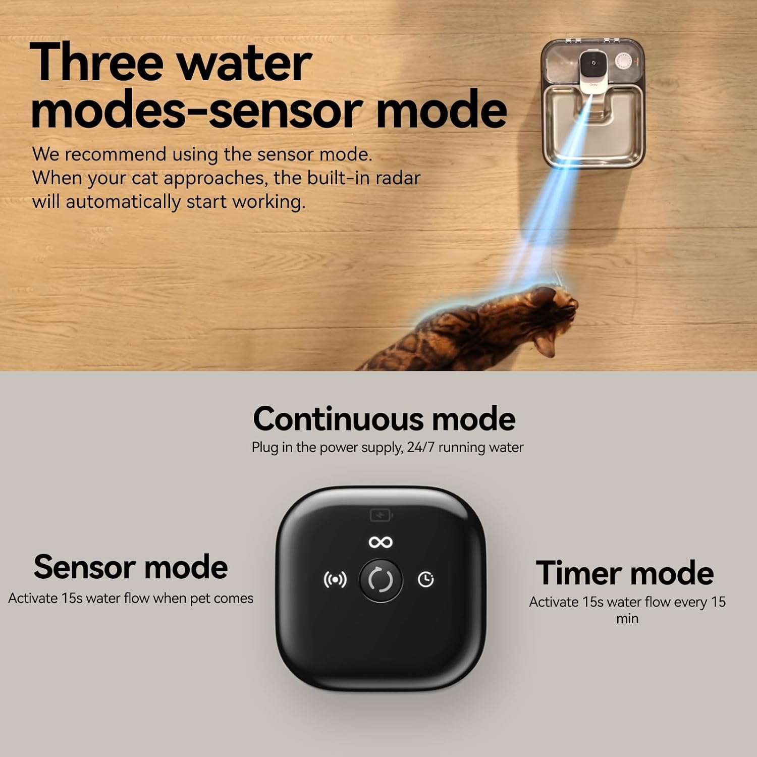 - [Three Water Modes]This wireless cat water fountain offers three working modes. Sensor mode supplies water for 15 seconds when your pet approaches within 59 inches. Timer mode has water flow every 15 minutes for 15 seconds. Continuous mode provides 24/7 running water when plugged in. We recommend sensor mode for power conservation.