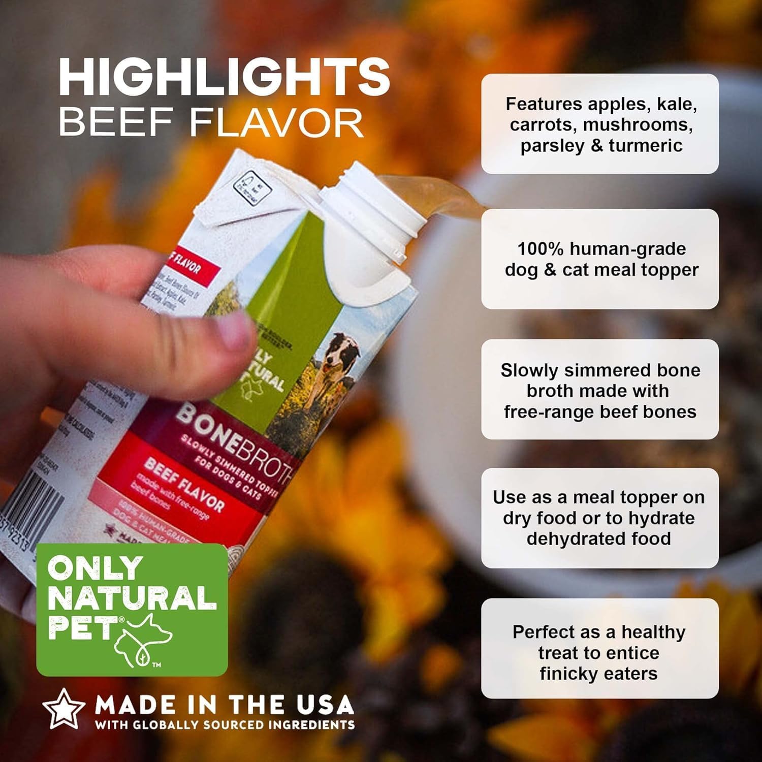 - Use as a Meal Topper on Dry Food or to Hydrated Dehydrated Food: Discover the delicious, nutritious, hydrating goodness of Only Natural Pet Bone Broth Beef Flavor Dog & Cat Meal Topper. This nutritious Beef flavor broth features free-range Beef bones and Beef fat, pumpkin, apples, carrots, mushrooms, sage, parsley, and turmeric