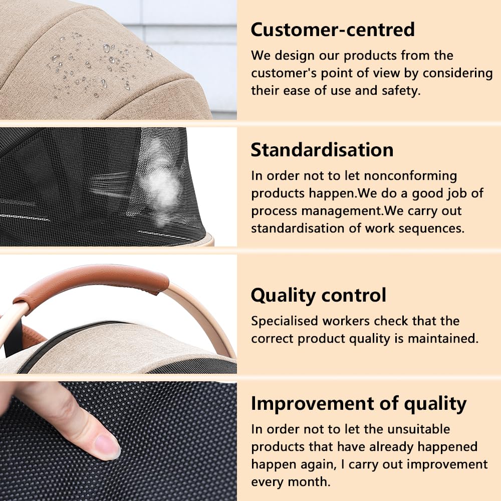 - SAFETY AND RELIABILITY: The four wheels are made of durable PU material to suit all occasions. The pushchair has large wheels and the front wheels can swivel 360°, these wheels not only ensure durability but also provide smooth and quiet operation. Whether you are walking on the sidewalk or on rough ground, our pet stroller will provide a comfortable and pleasant experience for your pet.