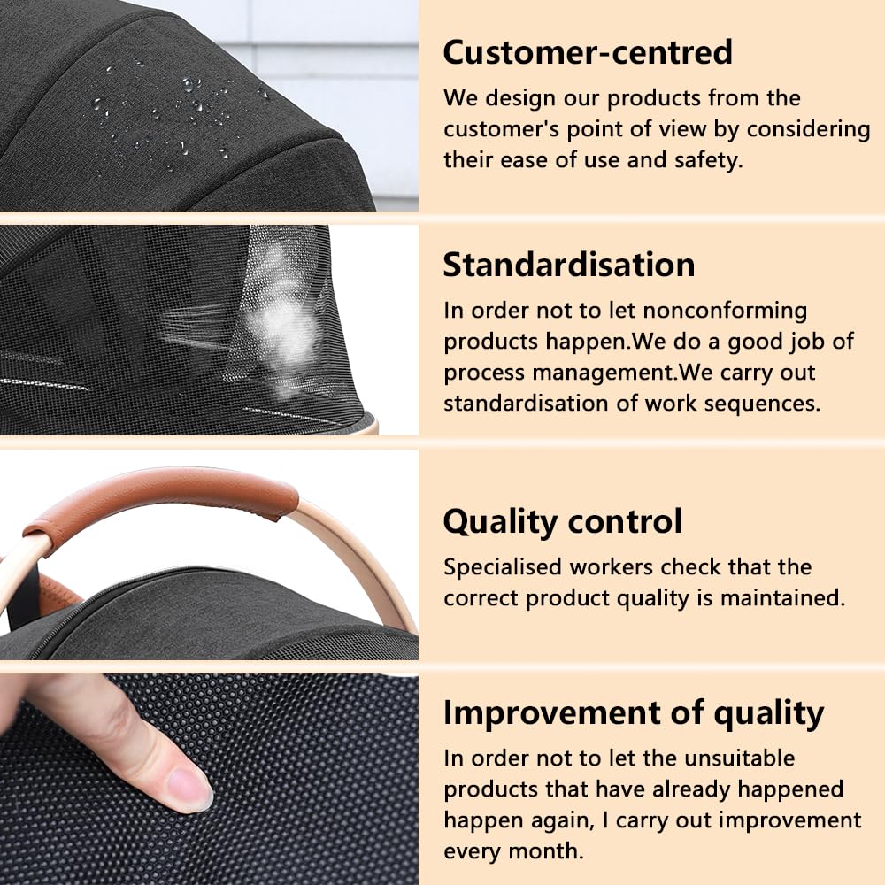 - SAFETY AND RELIABILITY: The four wheels are made of durable PU material to suit all occasions. The pushchair has large wheels and the front wheels can swivel 360°, these wheels not only ensure durability but also provide smooth and quiet operation. Whether you are walking on the sidewalk or on rough ground, our pet stroller will provide a comfortable and pleasant experience for your pet.