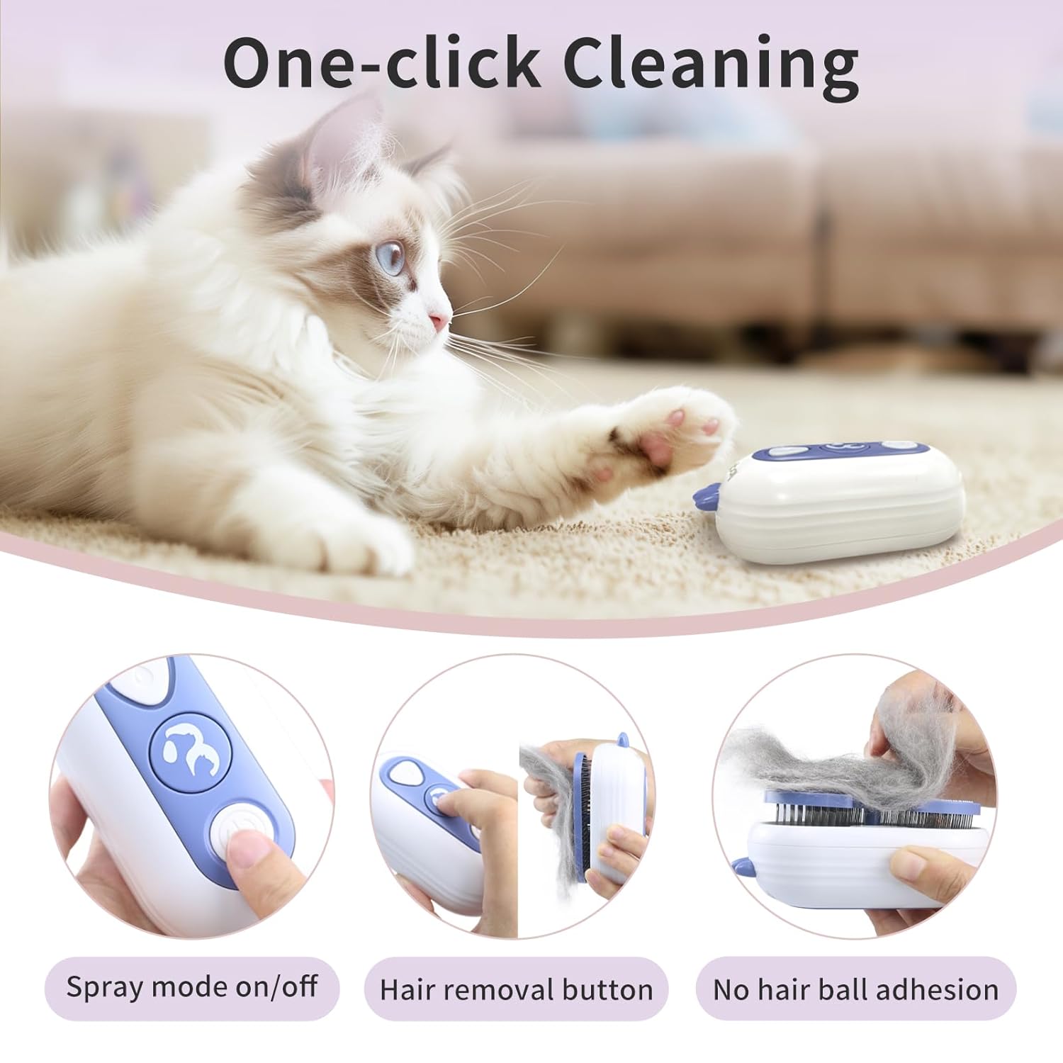 - 3-in-1 Care - The cat brush with steam combines hair removal, normal temperature mist spray, and one-button quick cleaning in one tool, simplifying the grooming process. The spray feature is especially helpful in preventing static electricity and keeping the fur soft and manageable. This pet steam brush is ideal for indoor use, allowing your pet to enjoy a self-grooming experience at home